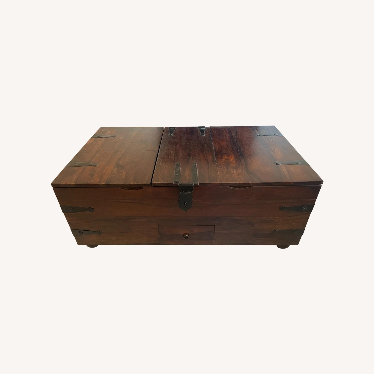 Seller's Notes:Taka Coffee Table by Crate & Barrel. The large rectangular storage pieces is constructed of solid wood with brown painted metal hinges and pulls, with removable bun feet. The interior has three sections for media and games, one has a removable divider for beverages and another has a smaller hidden compartment. Top doors open to expand playing, etc space. Durable and charming centerpiece for family or media room.