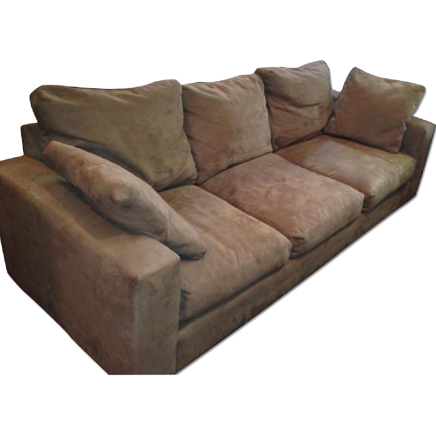 Seller's Notes:Crate & Barrel 3-cushion tan suede sofa w/down pillows on back and foam cushions Excellent condition, very comfortable.