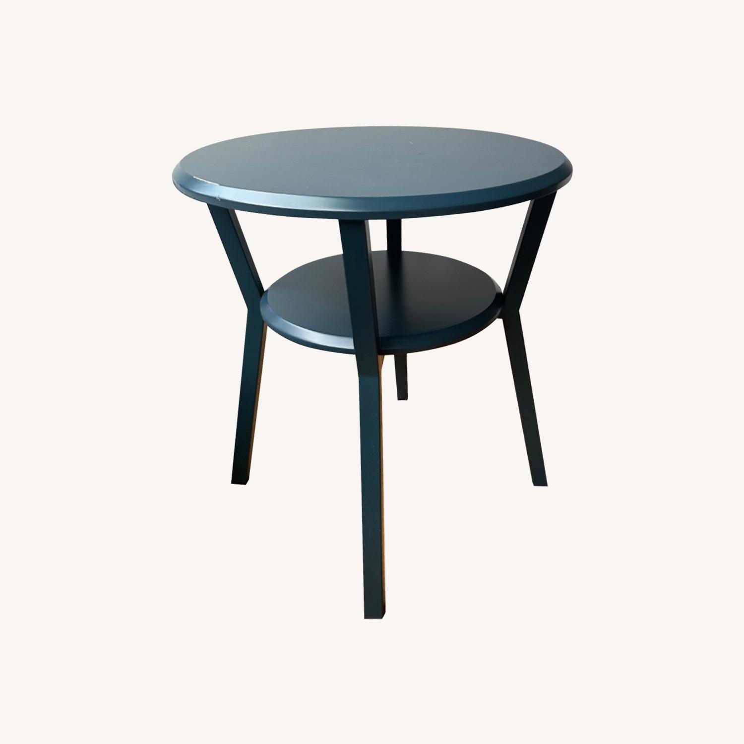 Seller's Notes:Chic and small wooden table by Crate and Barrel. Works great as a side table or nighstand. Has some cracks on the top (as visible in the picture provided) and is missing one screw but not wobbly at all. Top is 19 inch diameter ~RL