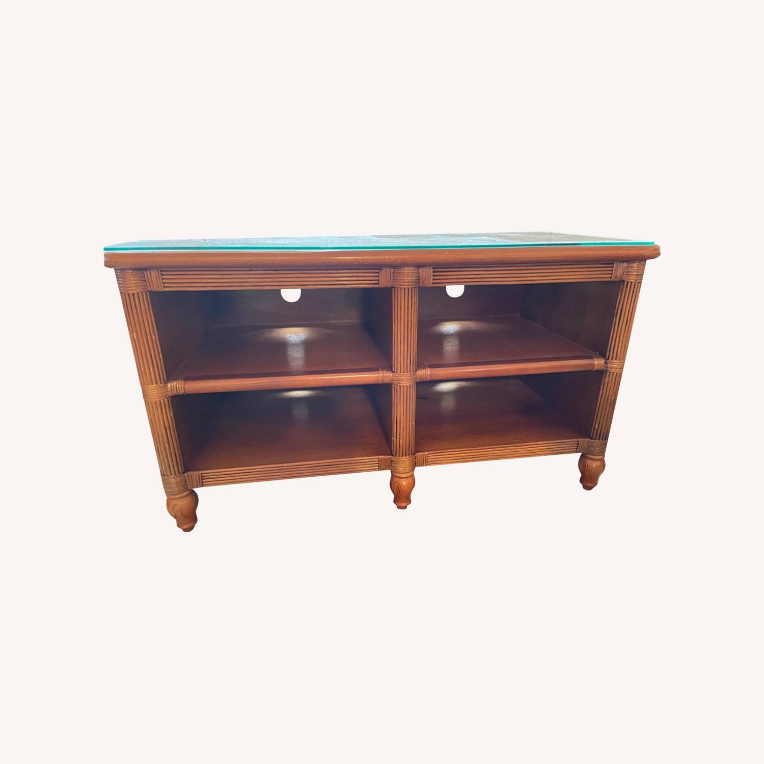 Seller's Notes:We got a new tv stand when we moved to go with our new living room design. This tv stand being sold is in very good shape. It is wood (medium shade) with wicker on the side and glass on top.