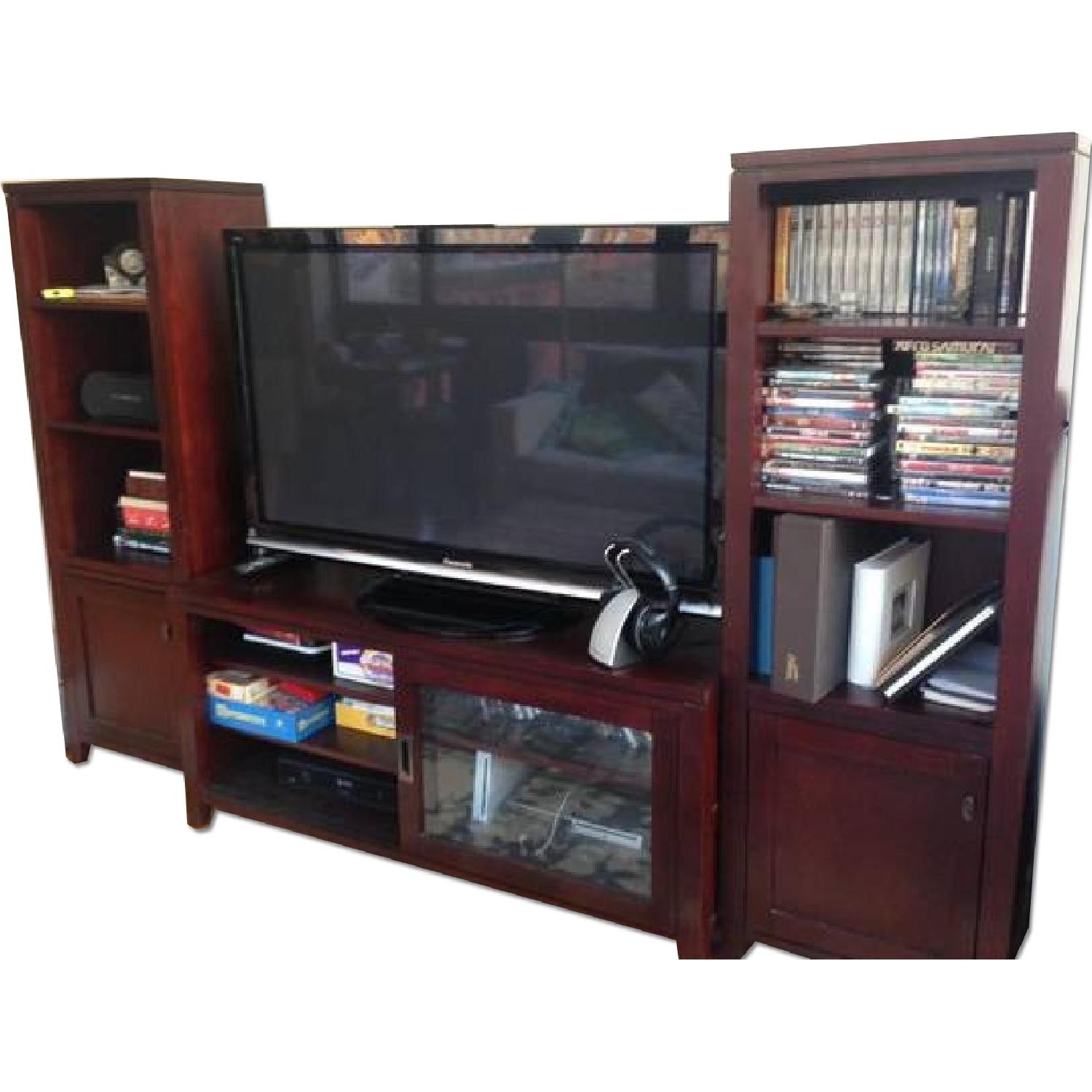 Seller's Notes:Crate & Barrel TV Stand with 2 Side Bookcases. Great condition,with only a few scratches/chips which are not noticeable. It has adjustable shelves which allows for customization. TV stand has sliding glass doors and cord cutouts in the shelves. Wood is dark brown with stainless steel door knobs. Dimensions listed below. TV stand: 52"wide, 21"deep, 24"high Bookcases: 20"wide, 14"deep, 60"tall