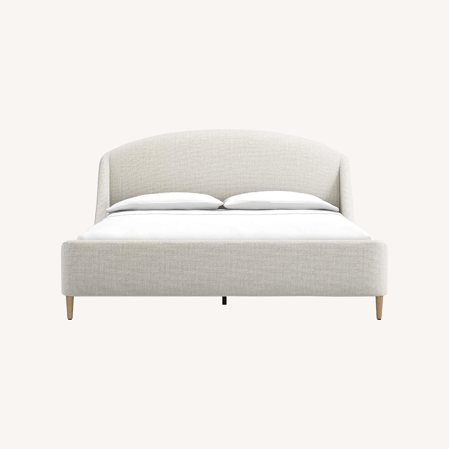 Lafayette streamlines the sumptuous curves of a French-style chaise into an upholstered bed for the modern bedroom. Fully upholstered in a naturally colored linen-like fabric, the bed curves down from the gently rounded headboard to slim rails that gracefully climb to form the lower-profile footboard. Turned solid oak legs have a natural finish to complement the upholstery and keep the look fresh and modern.