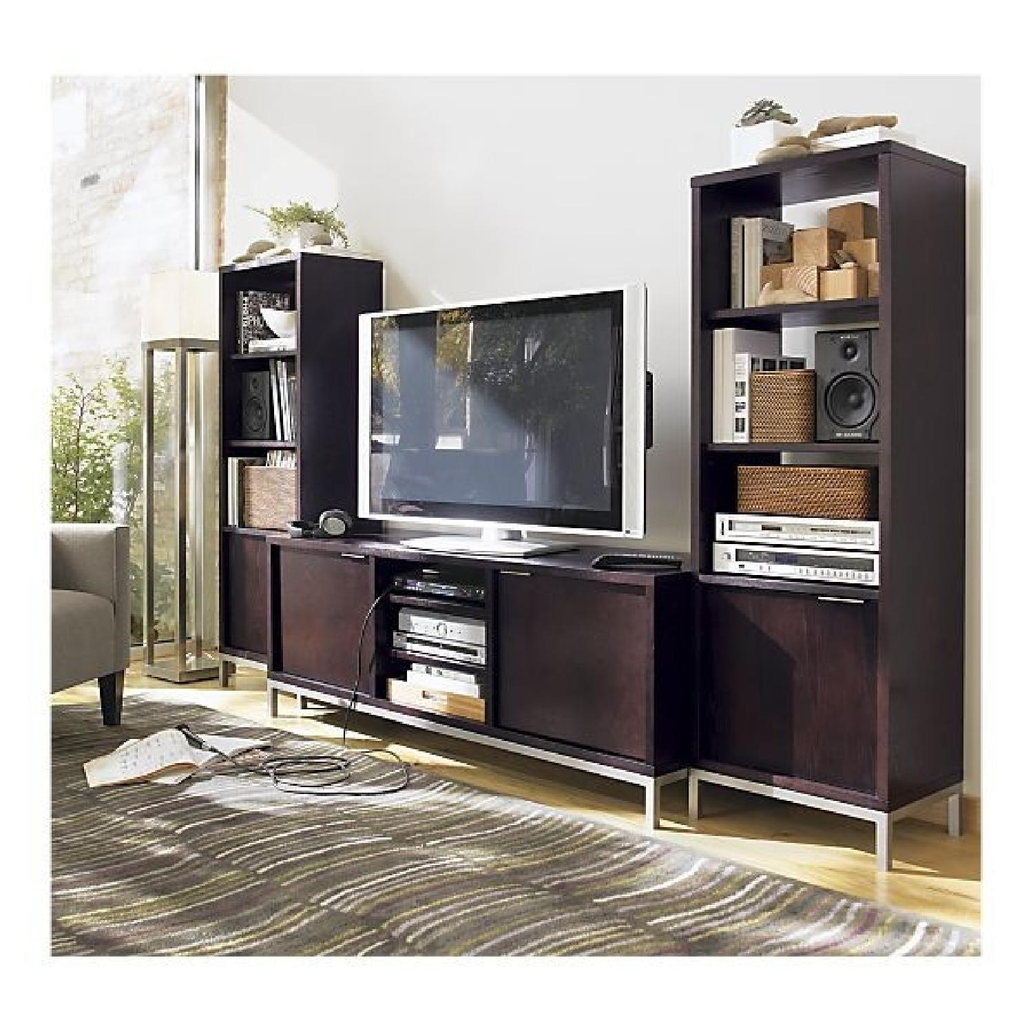 Seller's Notes:Crate and Barrel Wieden Media/Gaming Towers! Only the tower pieces being sold as a set. Dark espresso stained wood with silver metal base. Main console has exposed center area with three levels to place equipment (e.g. cable box, receiver) and two cabinets each with a shelf. One tower has a door but second one does not.