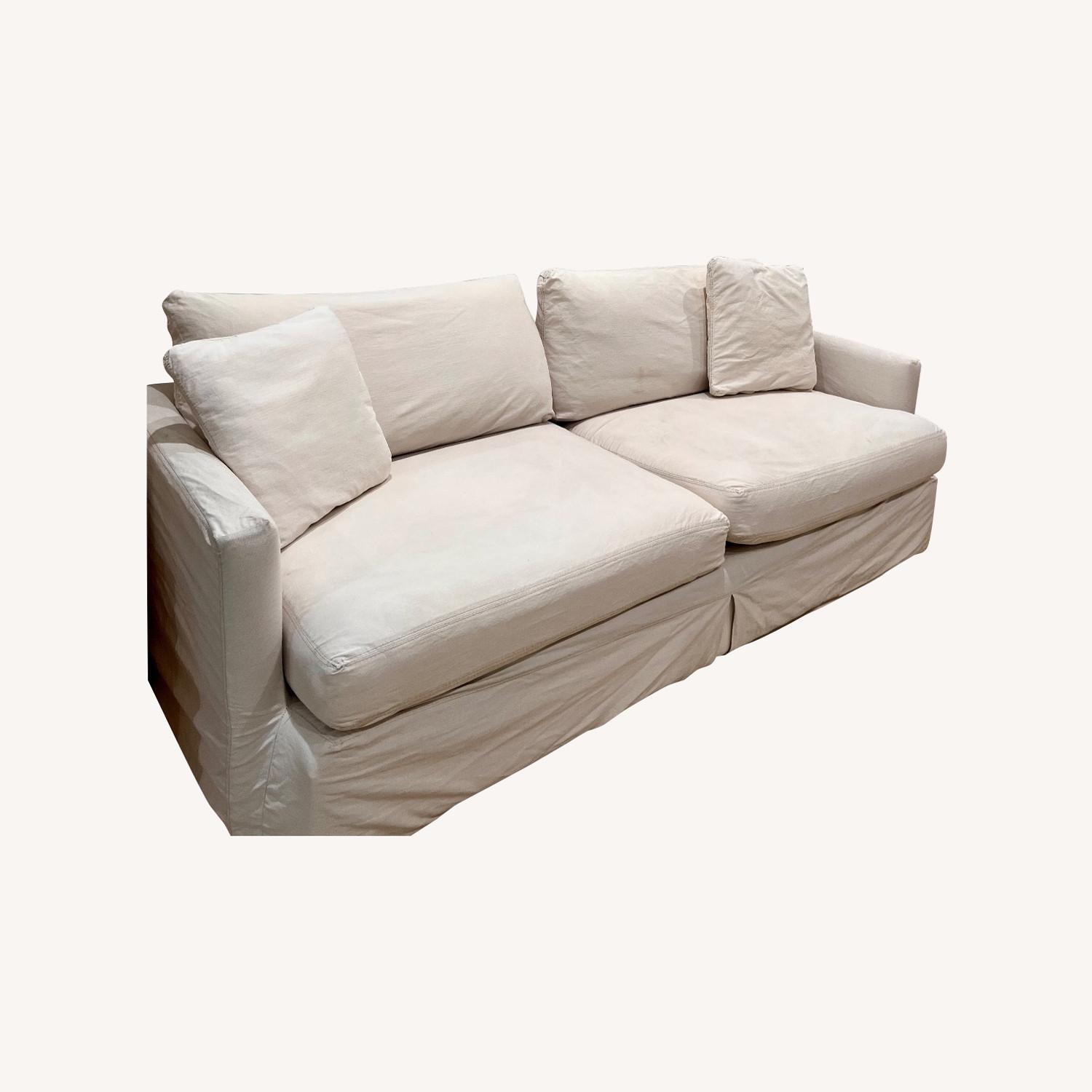 Seller's Notes:This Crate & Barrel slipcovered sofa has served us well, but we are downsizing from a brownstone to a condo and don't have space for it. It lived in the TV room and didn't get a ton of use. The sofa and cushions themselves are in excellent shape. The slipcovers have been washed multiple times (due to spilled drinks) so they aren't as pristine as they once were ;)