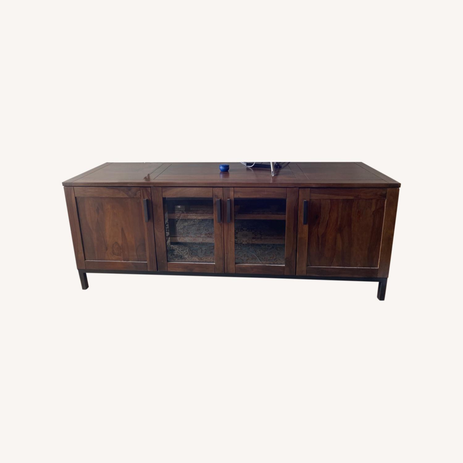 Seller's Notes:Clean structural lines float on an open, antiqued metal base to showcase the intriguing grain of solid mango wood, finished in sheer grey to lighten the look. It has double glass-fronted doors, providing a peek at spacious shelving. The Wyatt Grey 72" Media Console is a Crate and Barrel Exclusive.