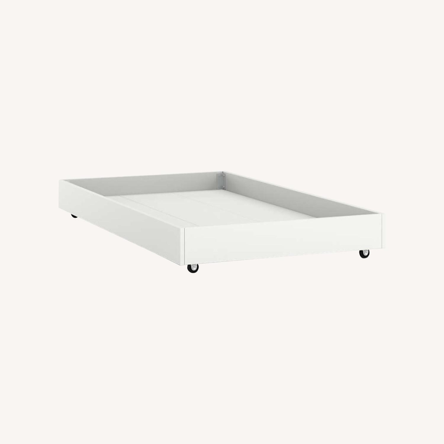 Seller's Notes:This is for the TRUNDLE that fits Crate and Kids beds. Surprisingly sturdy!! Holds a mattress but can also be used for tidy-looking under bed storage. * GREENGUARD Gold Certified, contributing to cleaner air in your home * Durable, child-safe water-based finish in white * Compatible with Jenny Lind twin and full beds (sold separately); not compatible with Jenny Lind queen and king beds * Requires a 5" trundle mattress (sold separately); will not accommodate a twin mattress * Includes five wooden slats to provide support when used as a bed; three wooden boards provide a base for storage use * Caster wheels for easy maneuvering * Crafted with durable American-sourced solid poplar, plus globally sourced poplar veneer and engineered wood