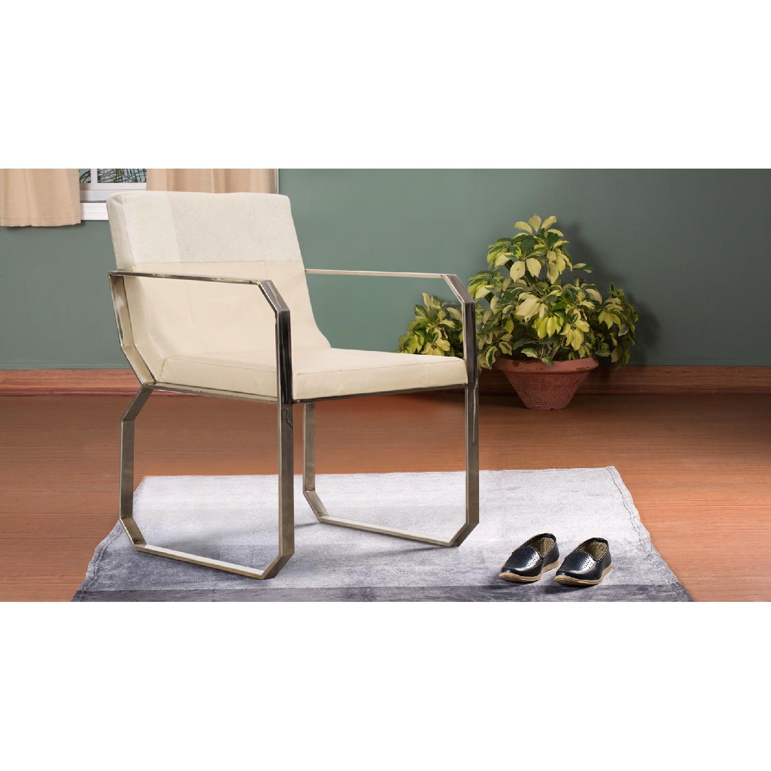 Seller's Notes:This cream leather dining chair is a perfect fit for any space in your home. Spruce up any room in a clean, yet sophisticated way. This chair is a great way to furnish your living room or dining area.A polished nickel frame and plenty of creamy leather topped with hair on hide means our chair has beauty & character. • DESIGN: This contemporary chair impresses with its high living- and working comfort. Whether in the home office or workplace, the contemporary chair is a fashionable workspace solution. • QUALITY: Made with best quality leather, hair on leather and stainless steel. Materials used for the chair are easy to care for. Bring style into your home or office with the modern chair. • MULTIPLE PLACE TO USE: This leather chair is widely applied in home as a perfect dining chair or accent chair. Its compact structure and beautiful design is perfect for your office, bedroom or living room. • PRODUCT DIMENSIONS: Overall dimensions of leather chair (W/D/H): 25 / 27 / 32 in. • PACKAGING: We are using double wall corrugated carton for all the products. Our packaging is all transit worthy as we conduct tests(including drop test) to ensure safe transit.