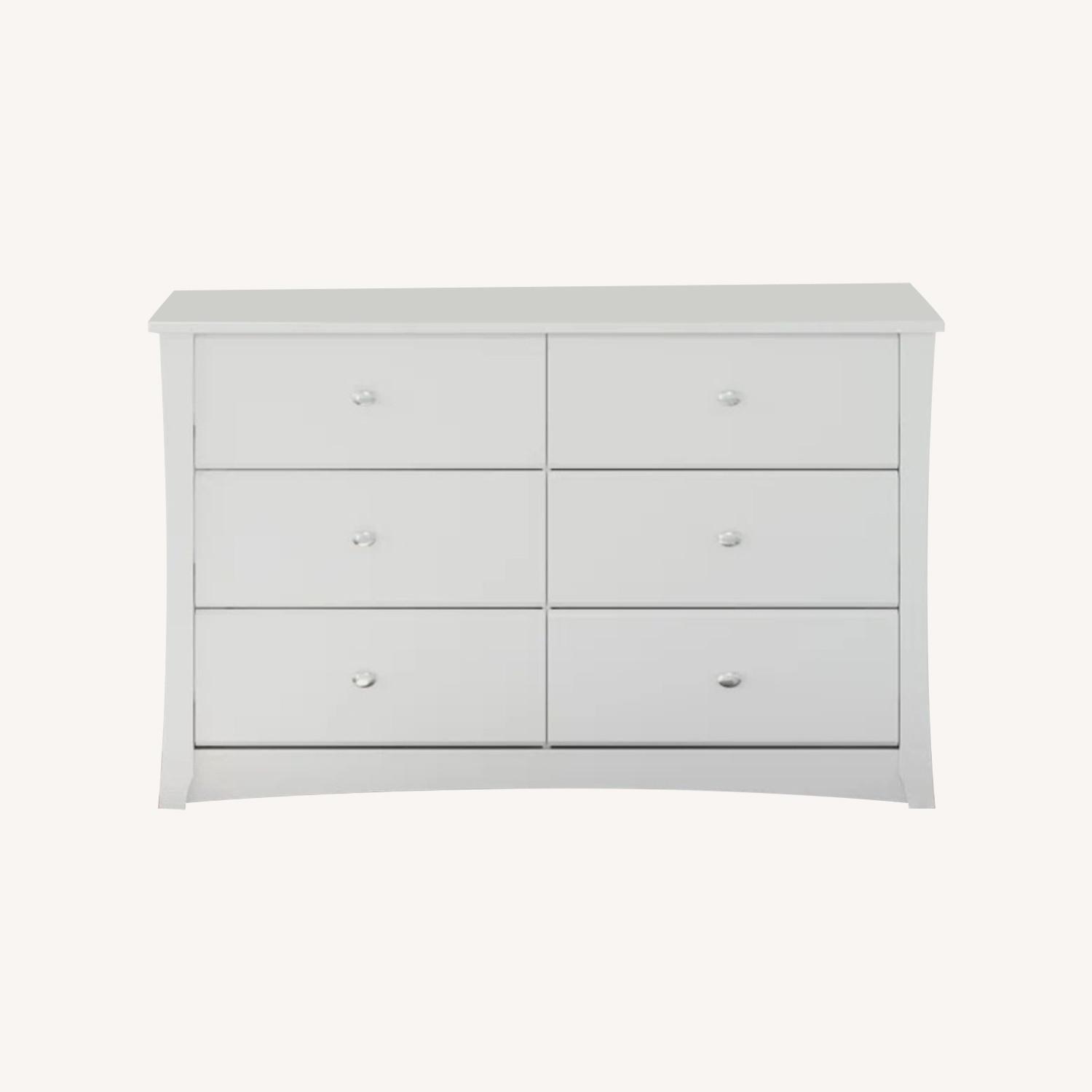 Seller's Notes:The Storkcraft Crescent 6-Drawer Double Dresser is a universal nursery and bedroom storage solution featuring stylish metal knobs for an added modern flare. Crafted with engineered wood, this durable double dresser features 6 spacious drawers, durable steel hardware, euro-glide drawers with safety stops, and is fastened with German cam locks for dependable and reliable construction. The Crescent is expertly tested by independent laboratories to guarantee this product meets the highest standards for your child’s safety and complies with all applicable federal anti-tipping standards.