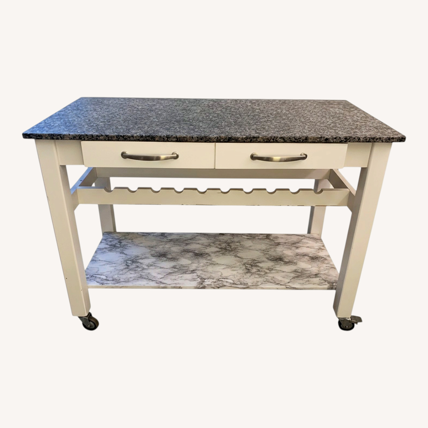 Seller's Notes:Granite top kitchen island rolling cart featuring two drawers, a built-in wine rack, and a bottom storage shelf