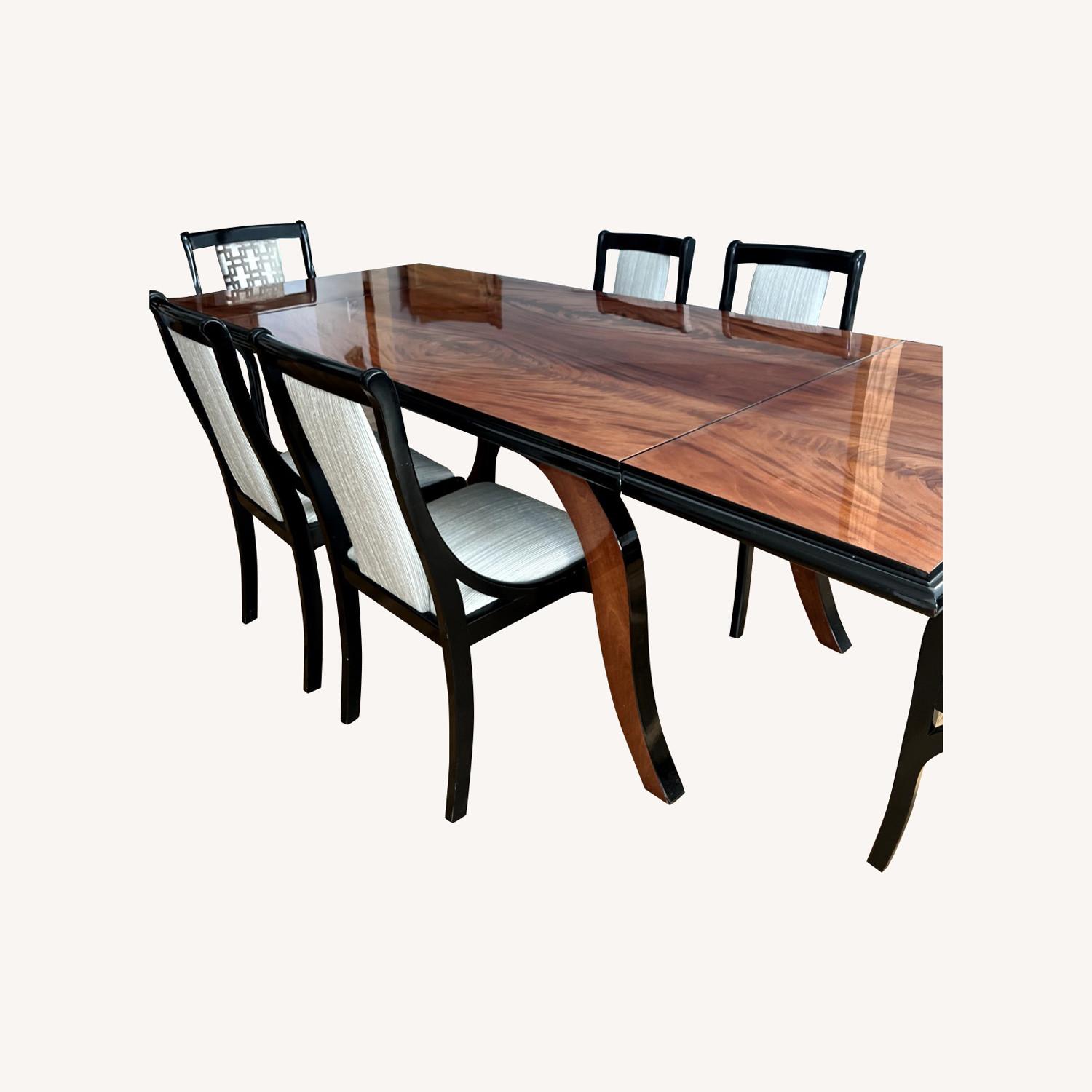 Seller's Notes:Timeless beauty, this magnificent crotch mahogany rectangular table with two extension leaves is exquisite in every way. Open table with leaves: 108 L x 40 W x 31.5 H Closed table 60 L x 40W x 31.5 H Leaf extension: 24" each
