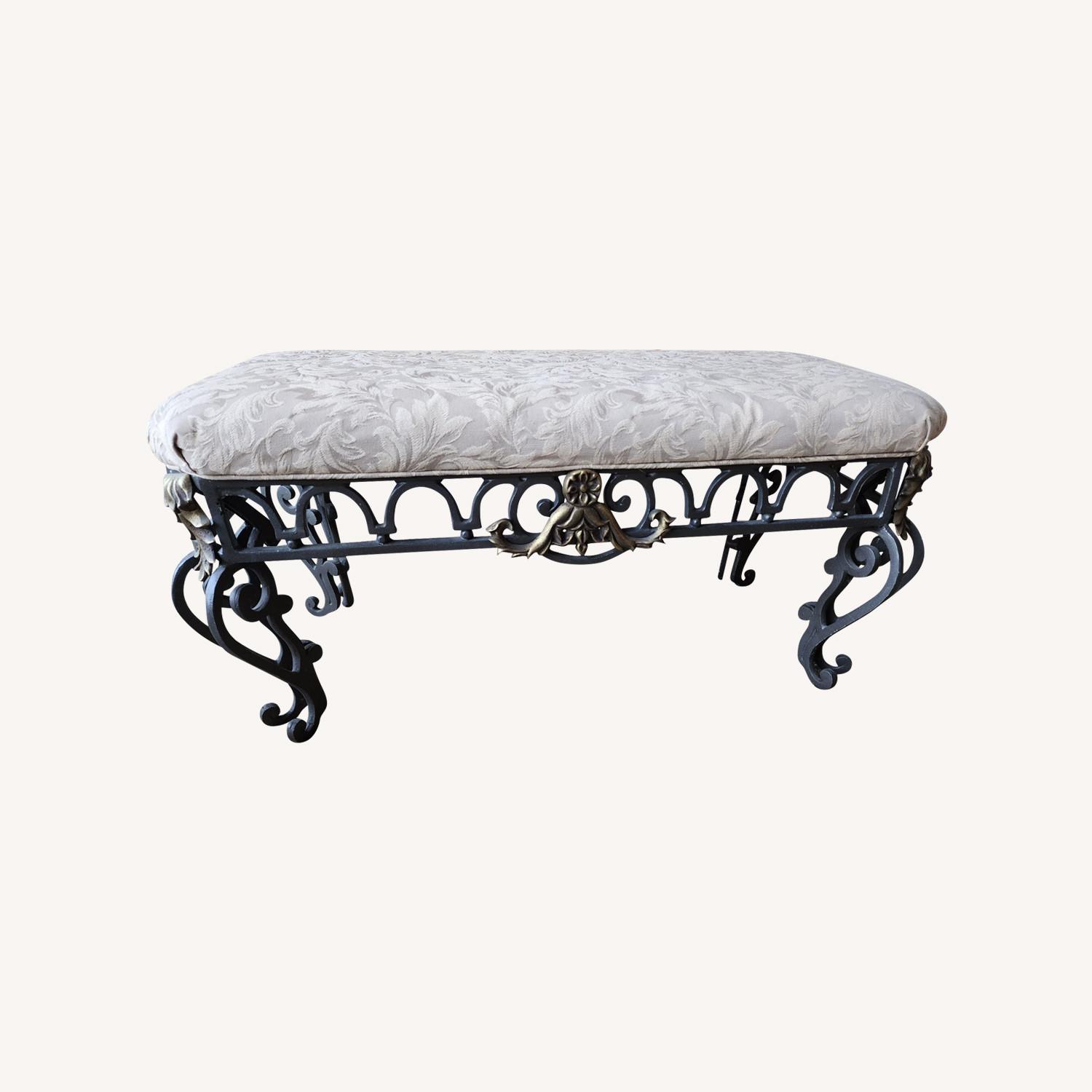 Seller's Notes:Covered in a ecru cotton blend brocade fabric, this substantial decorative piece is in "like new" condition. The base is wrought iron with decorative gilt shields a d cabriole legs. It's a wonderful accent piece that has been lovingly cared for.