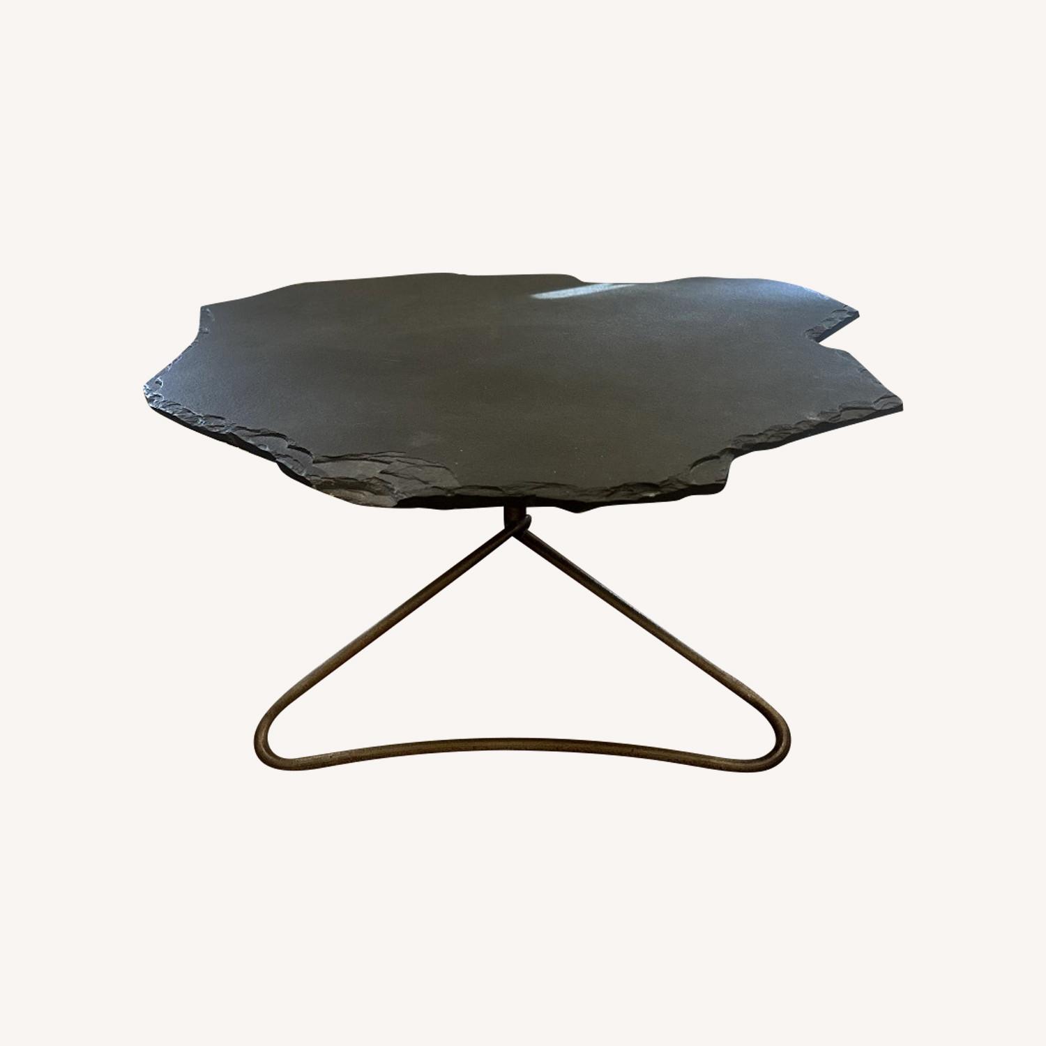 Seller's Notes:Please note that this table is HEAVY! About 130 lbs. Made from slate, this table features a raw, organic tabletop set on a three-pronged iron base for a contrasting look. Measures 37'' long, so there's plenty of room for your coffee table books, wine, etc. This table is amazing because you don't need coasters for your drinks, it doesn't stain or scratch, so easy to clean etc. Sad to see it go but doesn't fit our new space.