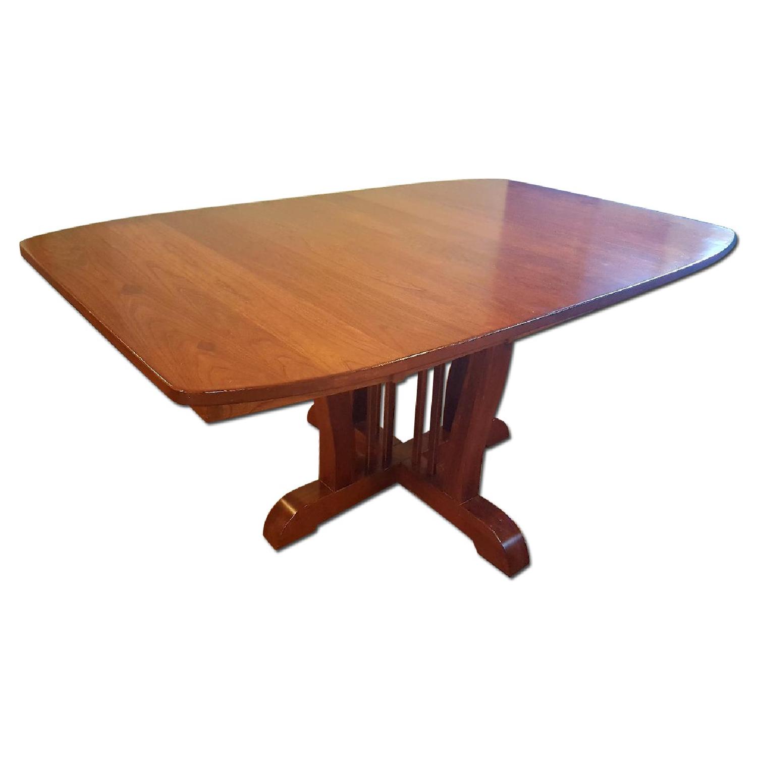 Seller's Notes:42" x 54" Classic Top Classic Mission Single Table with Solid Wood Aprons, Double Equalizer Slides, Full 1" Top, Eased Edge, Walnut Diamond Inlays on Top, Walnut Diamond for Bolt Covers, Walnut Button Plugs, and Walnut Gap Covers. One leaf included adds 12" to length (42" x 66") Bought back in 2009 as a set. Custom built by amish in Ohio. Opens to allow a leaf. Leaf stores in table (see pics). Minor scratches from cat can easily be fixed. High-quality, solid wood (oak & cherry) with diamond shaped inlays. Easily comes apart for shipping. Recently renovated and need to go with round table.