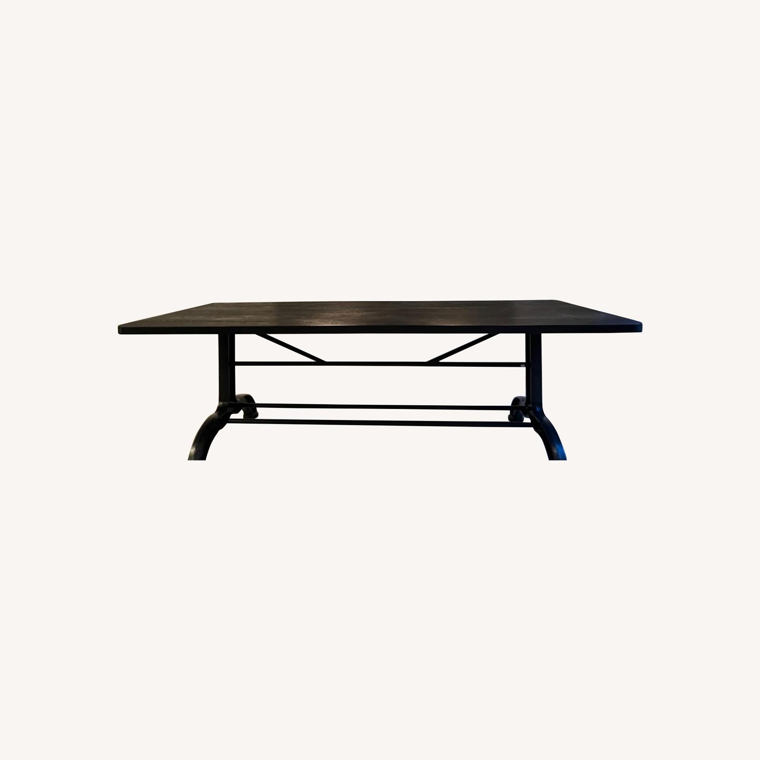 Seller's Notes:This is an incredible wood table anchored with iron legs. The table itself is finished in black with a black metal seal around the edge. The table is in excellent condition given 2 of 4 years of stay in this apartment it did not get much use (COVID-19).