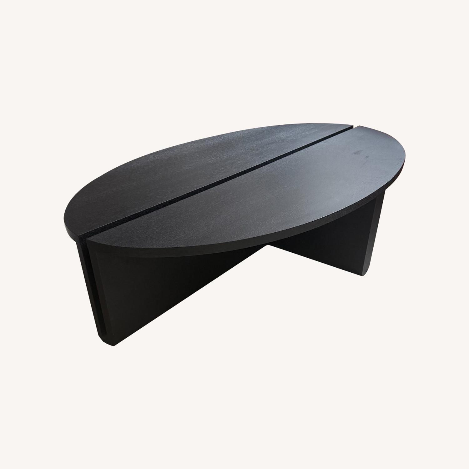 Seller's Notes:Custom wood oval coffee table in black. Table is made from solid wood, and was custom made in 2020. The table is a modern statement piece, with decorative oval shape and edgy style.