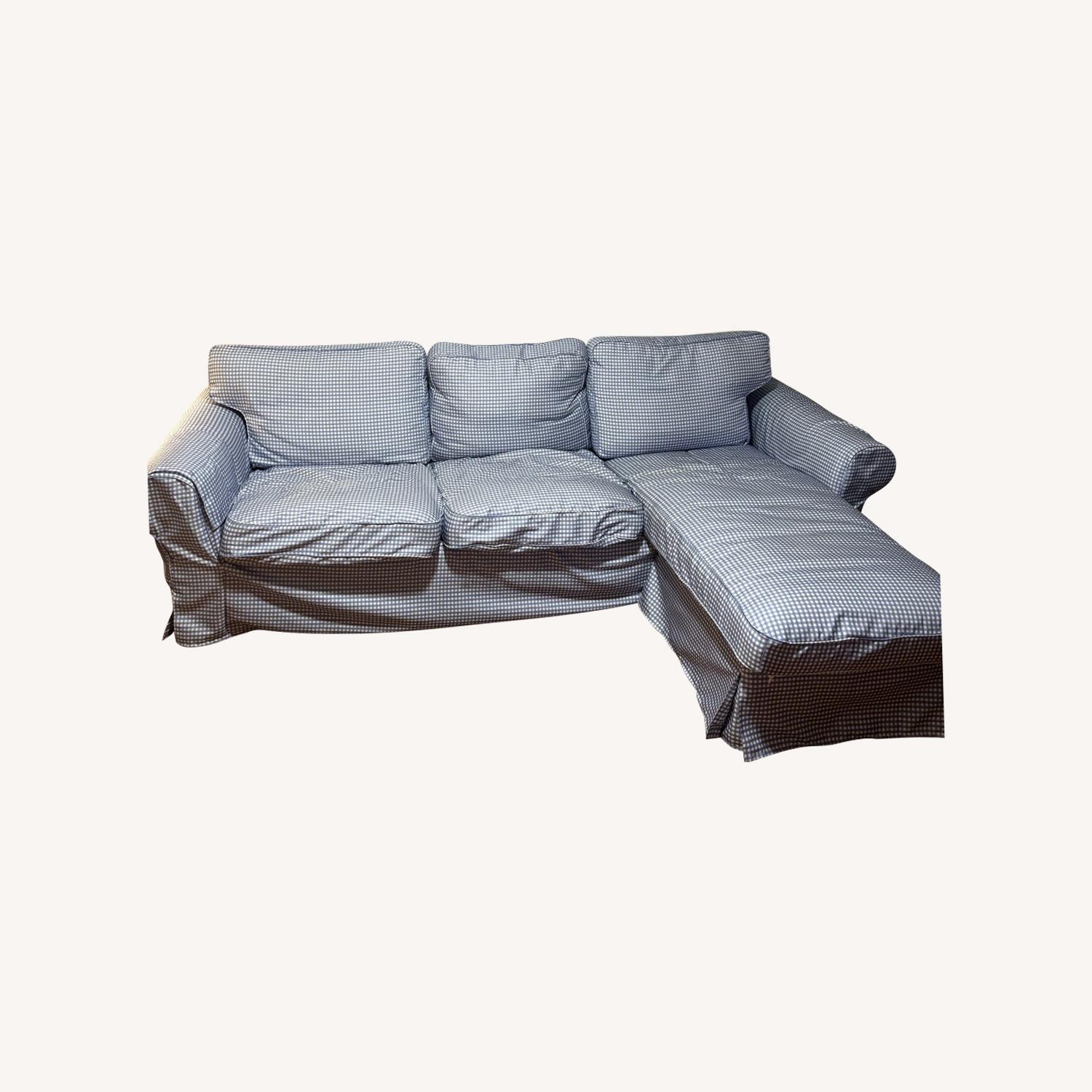 Seller's Notes:Custom blue gingham sofa covers from Etsy in great condition only used for a couple of months. High quality fabric with a pouch sleeve included. The base sofa is an Ikea Uppland couch 3 seater with a chaise lounge. Super beautiful sofa! The sofa underneath has stains and tears but is fully functional, there are a couple screws missing that can be replaced but the couch can still be assembled without it. With the couch covers on there are no imperfections on the sofa.