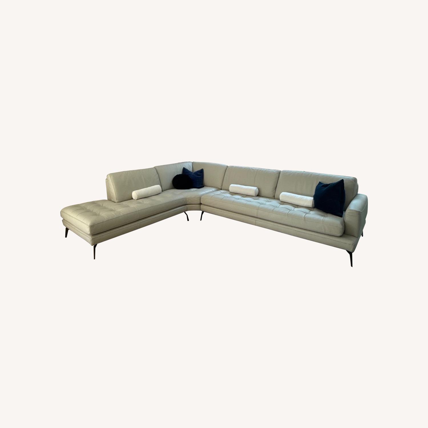 Seller's Notes:This gorgeous sectional was custom made in Italy and ordered through a distributor, Robb & Stucky. The leather is supple in a neutral tan color. It’s neither cold leather nor sticky, think of true, well-crafted Italian leather. It was bought for a second seasonal home in a surplus room and has barely been used in the last three years.