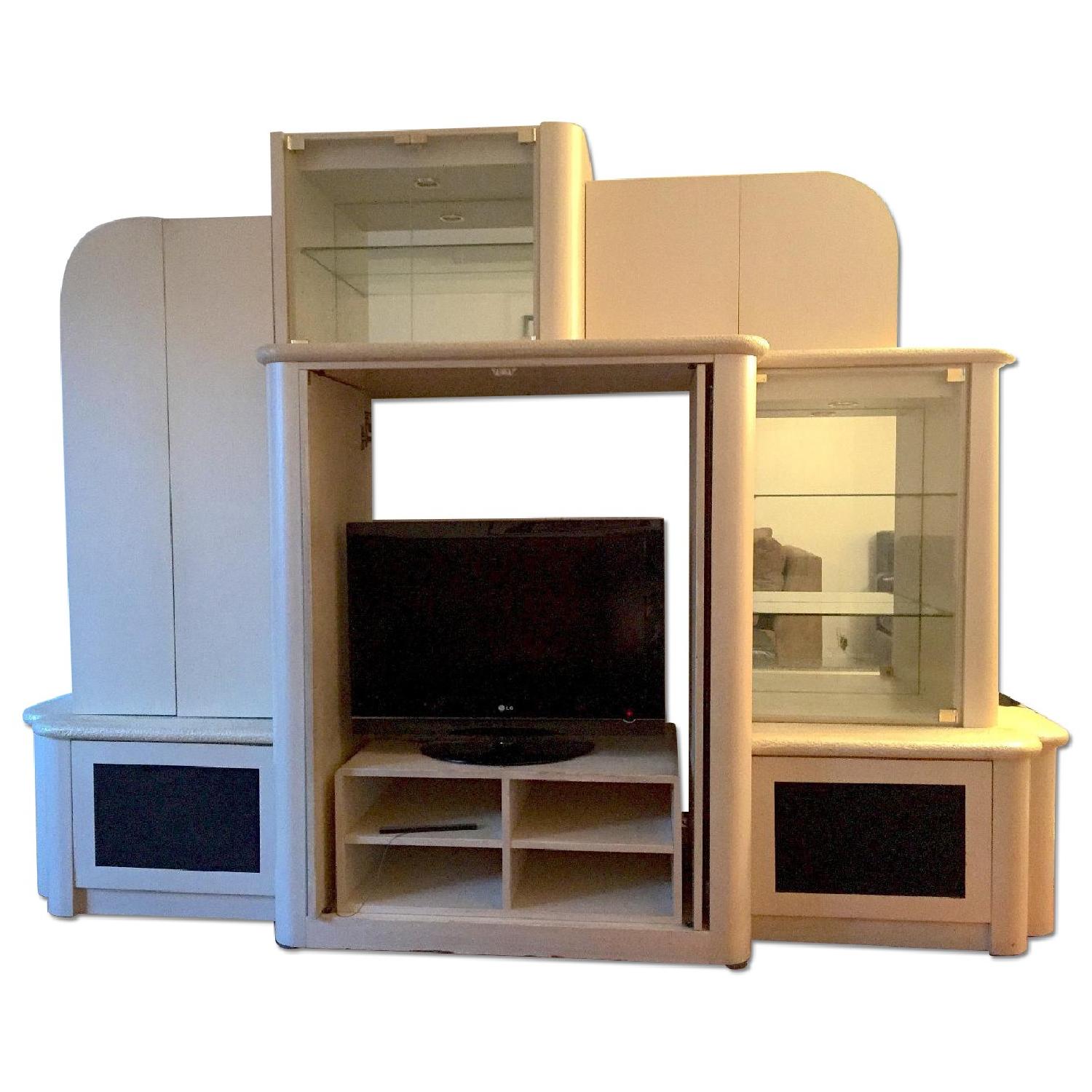 Seller's Notes:This a large wall unit with enclosed space for glassware and media equipment. It was originally purchased from Foremost Furniture. We originally paid over $12,000 which was below the list price. The wood is pearlized ash and it has faux stone accents. There is slight wear to the some of the wood especially on the console where the TV sits. There are some minor stains on the faux stone. The doors in front of the TV close and there is a scratch in the wood across the top from where the doors slide on a track. There is lots of storage. The glass cabinets are lighted but the bulbs need replacing. The shelves in the glass cabinets are adjustable. It has room for a 32 inch TV.