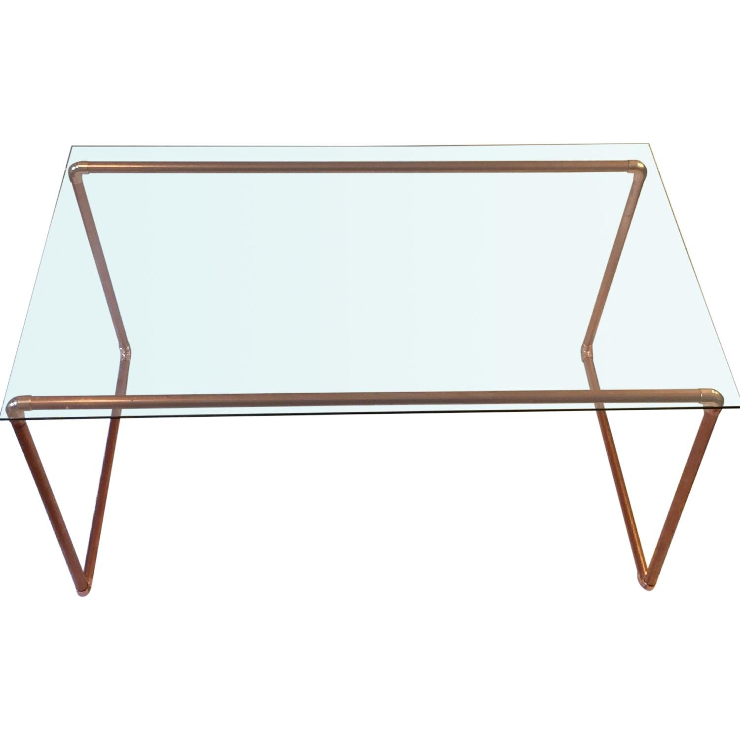 Seller's Notes:Glass top table with copper frame. Height 16 inches, length 31.5 inches, width 19 inches. This table was custom made from genuine copper pipe and glass by an artist in Astoria. The top is separate from the frame, making easy to move or store, while still being sturdy. The frame can be flipped over to offer another design option.