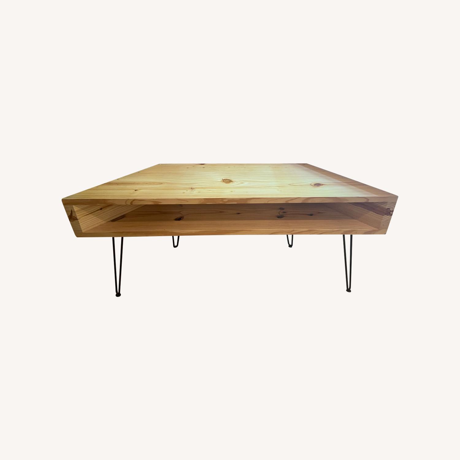 Seller's Notes:Selling this custom corner TV console table fit to hold a large TV with a shelf for storage underneath. Made from natural wood with hairpin legs. In excellent shape. Selling because we have to move.