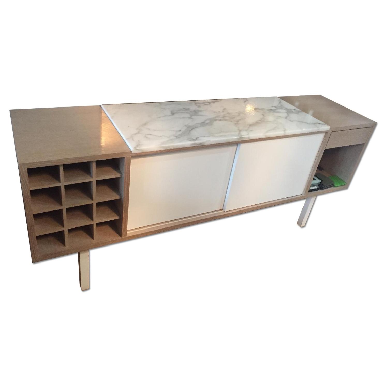 Seller's Notes:This is a custom piece. This beautiful piece incorporates open storage, closed storage, and wine storage. The mix in materials is what really makes this item stand out. The wood, marble and metal all blend perfectly. It is in great condition. Please feel free to contact about pricing! MUST GO- Contact if question on pricing