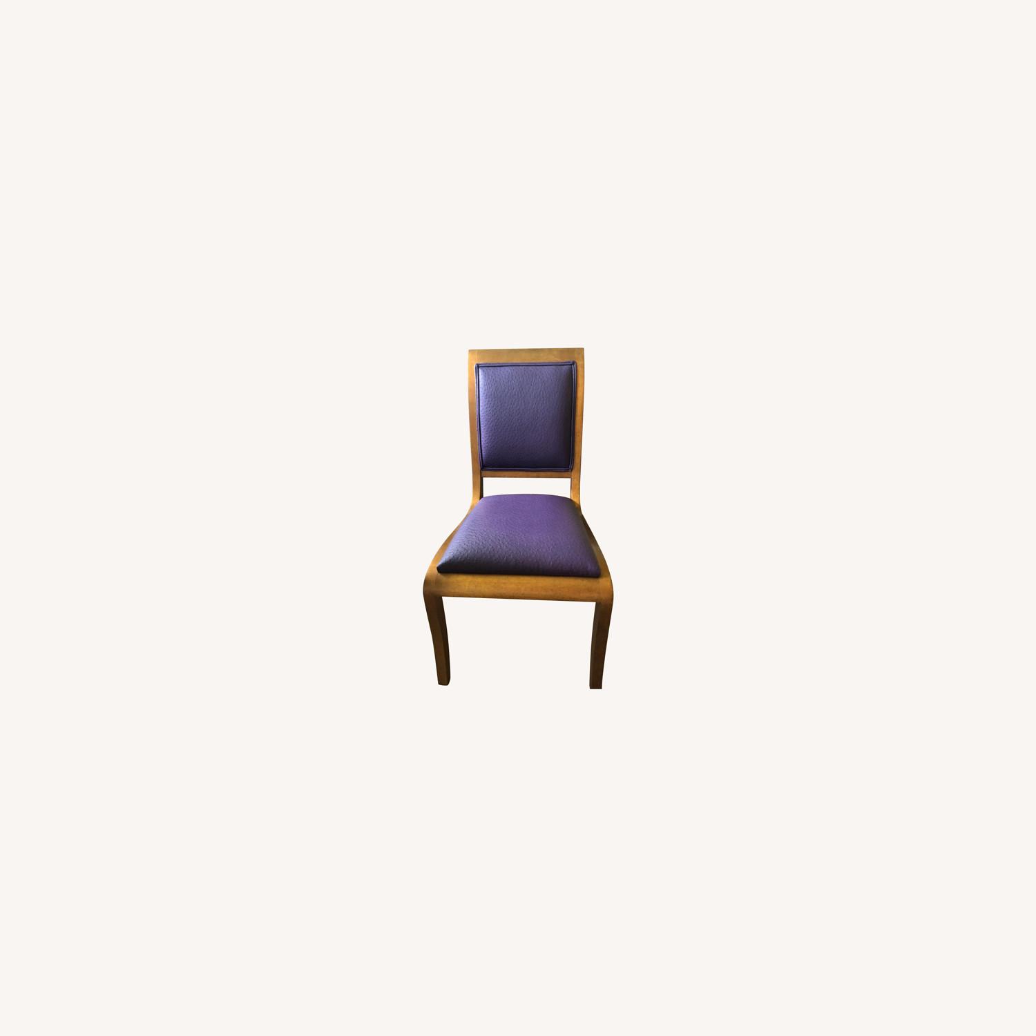 Seller's Notes:Well loved Bau gold-tone custom dining chairs. Indestructible, faux purple ostrich upholstery