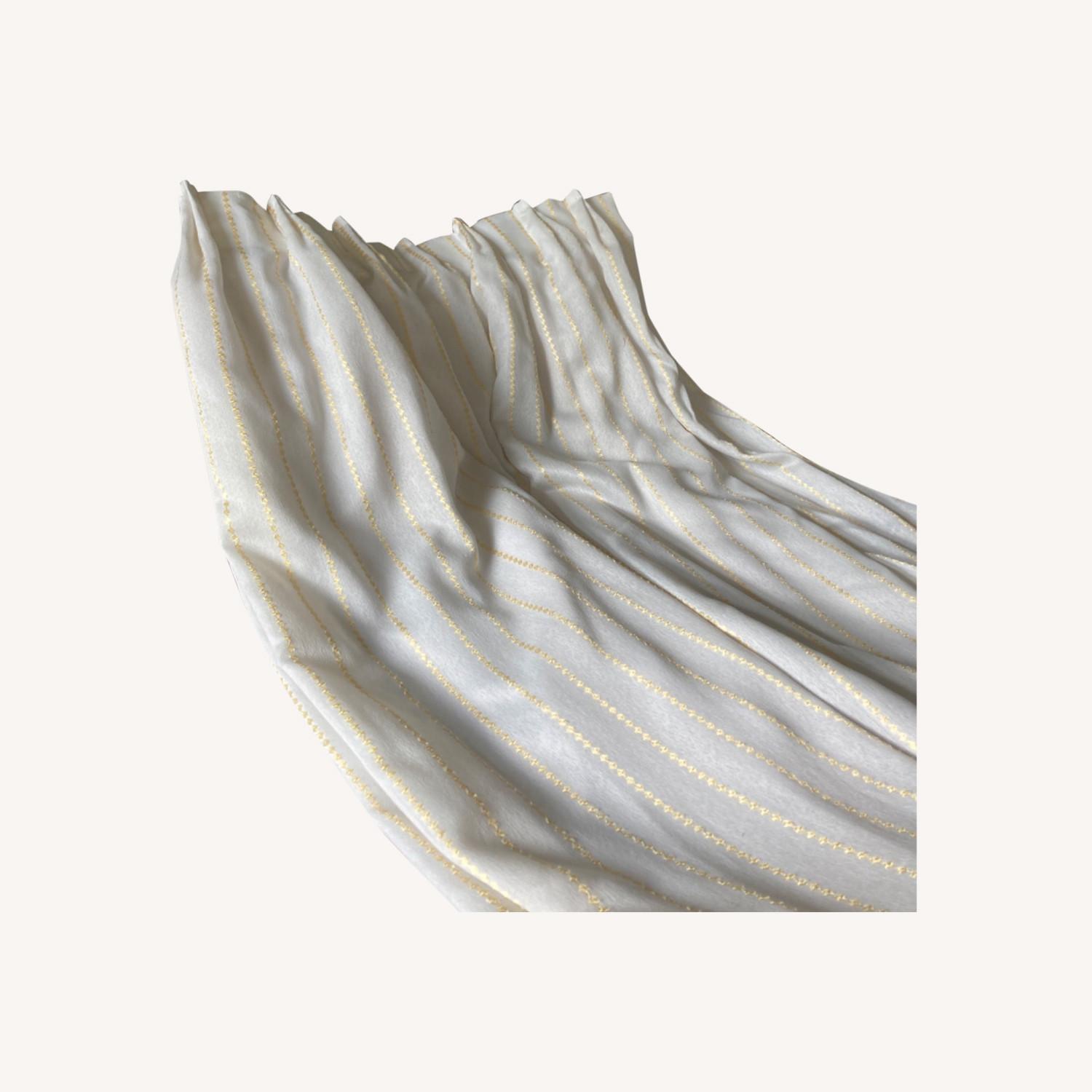 Seller's Notes:Lovely custom pinch pleat drapes. Semi-shear. Light airy but definitely a lovely finishing touch to the windows! Fully lined and weighted. Set of 4.