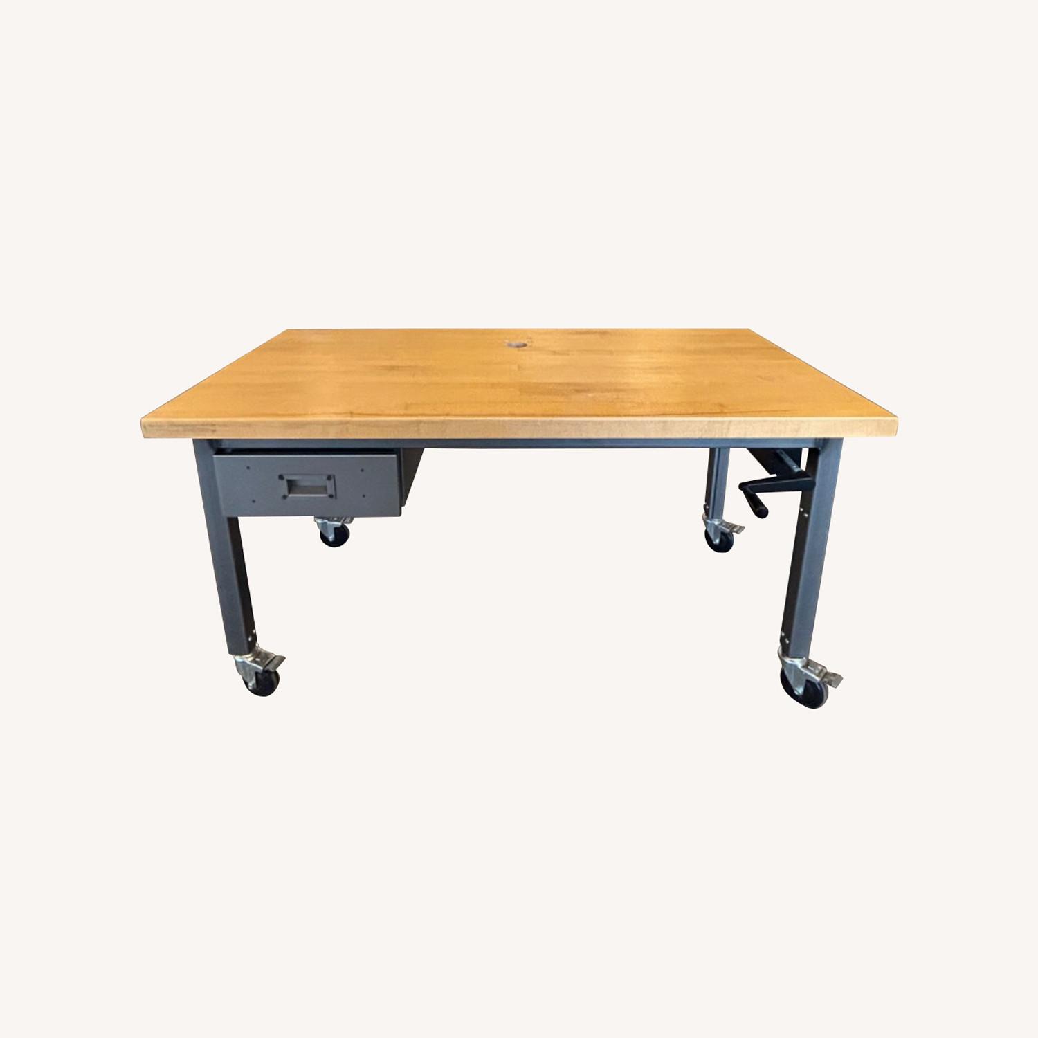Seller's Notes:American-made Formaspace offers standard, modified, and custom workbenches. This workbench has Welded metal frame with custom hydraulics that can support up to 1k pounds. Solid maple wood. The hand crank adjusts to your preferred height, wheels for easy maneuvering, and a hole perfect for running cables.