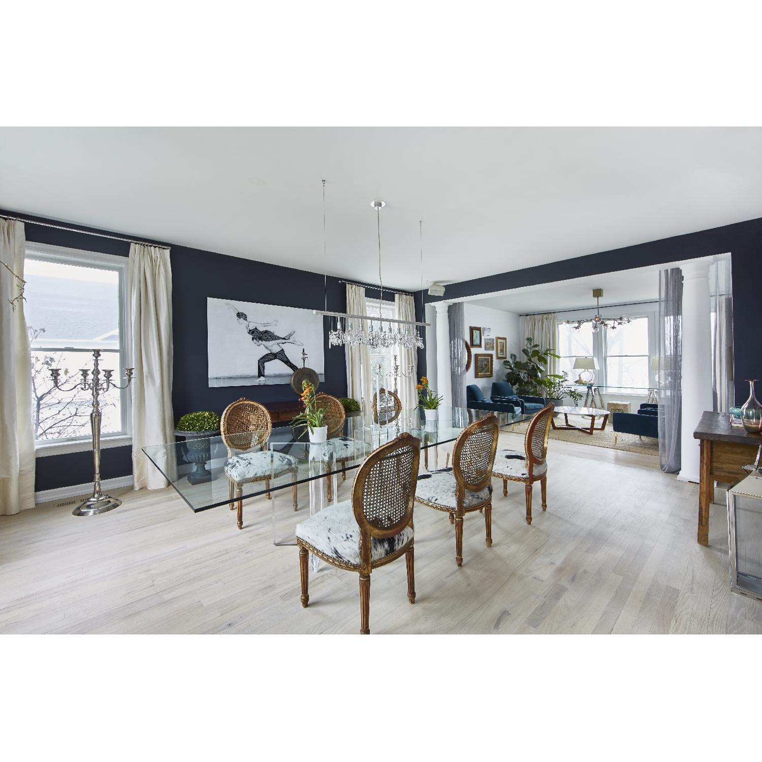 Seller's Notes:Custom dining table includes 120"x48"x2/3" glass (originally $1050) and 3 custom lucite bases (originally $750 each). Also includes 2/3" protective pad that folds into 3 small pieces for events at the table. In great shape. Seats 12 comfortably but it has seated almost 20!