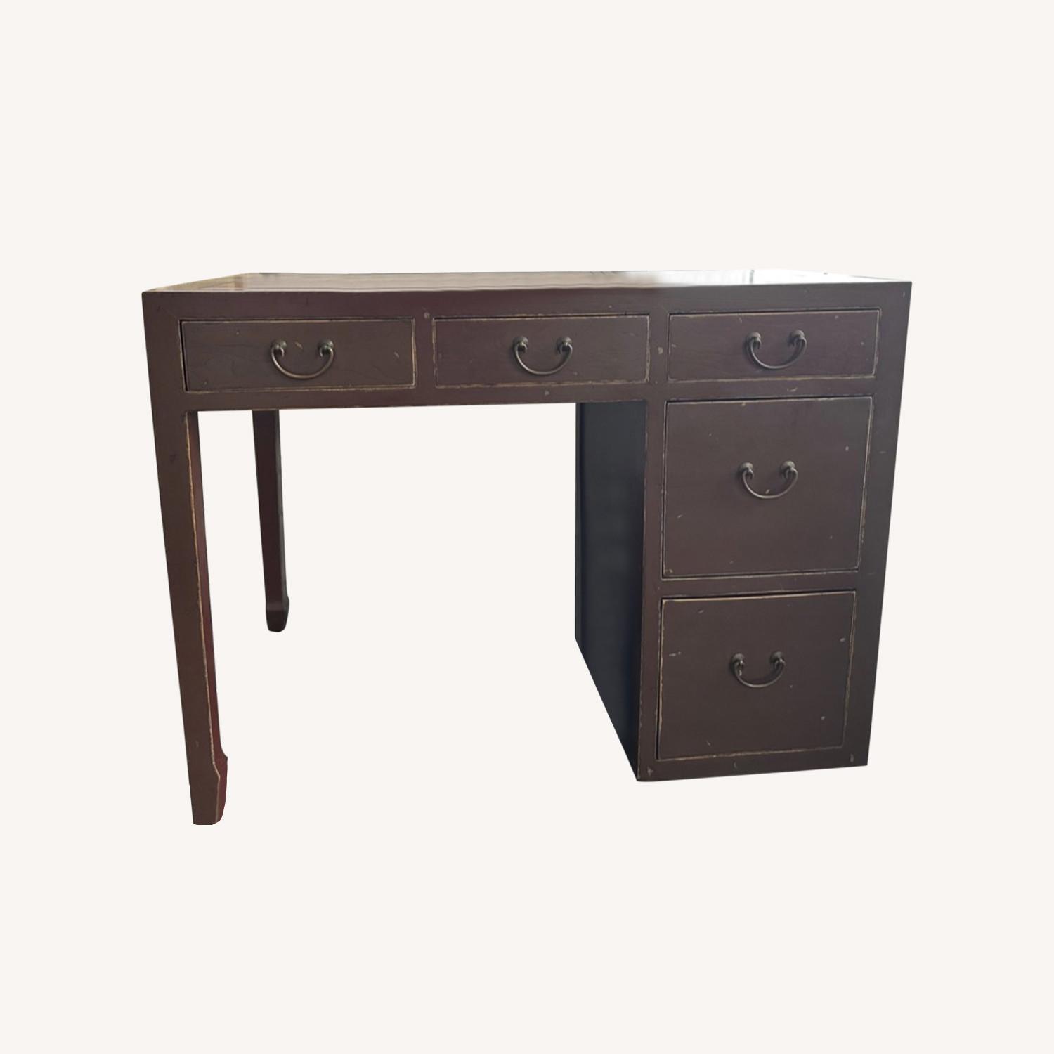 Seller's Notes:Dark red, solid wood with brass ring pulls, Chinoserie-style, desk. Custom made in Asia and remains in excellent condition (the paint is artfully distressed to add to the antique look). Includes a special file folder cabinet storage built-in to the bottom shelf. We are selling because we have moved and no longer have room for this beautiful piece but are sad to part with it.