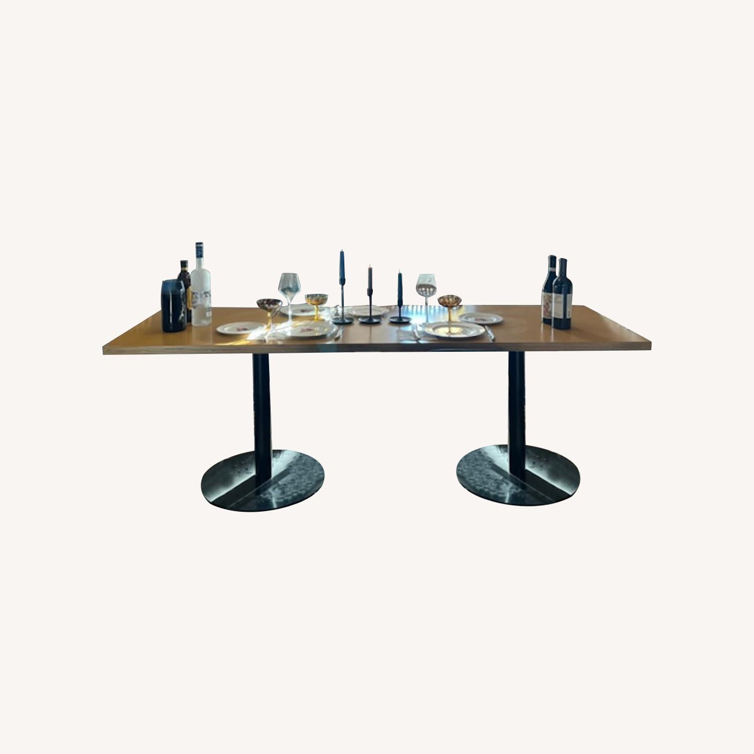 Seller's Notes:Custom Lichen NYC yellow wood dining table with black metal legs. I had this table custom made and the sizing is perfect for more narrow kitchens or dining rooms. I've had so many amazing dinner parties that comfortably seat 6-8 people around the table. It's super sturdy and well made and I'm sad to be parting with it.