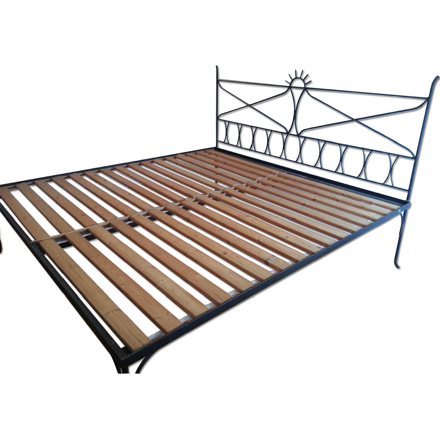 Seller's Notes:This elegant and sturdy cast iron bed frame with wood slats was custom-made by a Swedish artisan. It measures 79 wide x 83 long x 19 high. Headboard is 52 tall all the way to the top. The head and legs are detachable for transportation. This is a solid and very expertly crafted bed with attention to detail. The only reason I am selling it is because I have moved to a place with a much smaller bedroom.