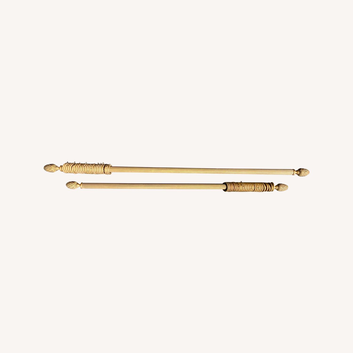 Seller's Notes:Two custom made gold finial curtain rods. Minor discoloration on some of the included rings (see photos). Please see exact dimensions below: First Rod: 73"Lx2"W Second Rod: 62.5"Lx2"W Finials: 5"L each (not included in L above) Beautiful addition to any windows.