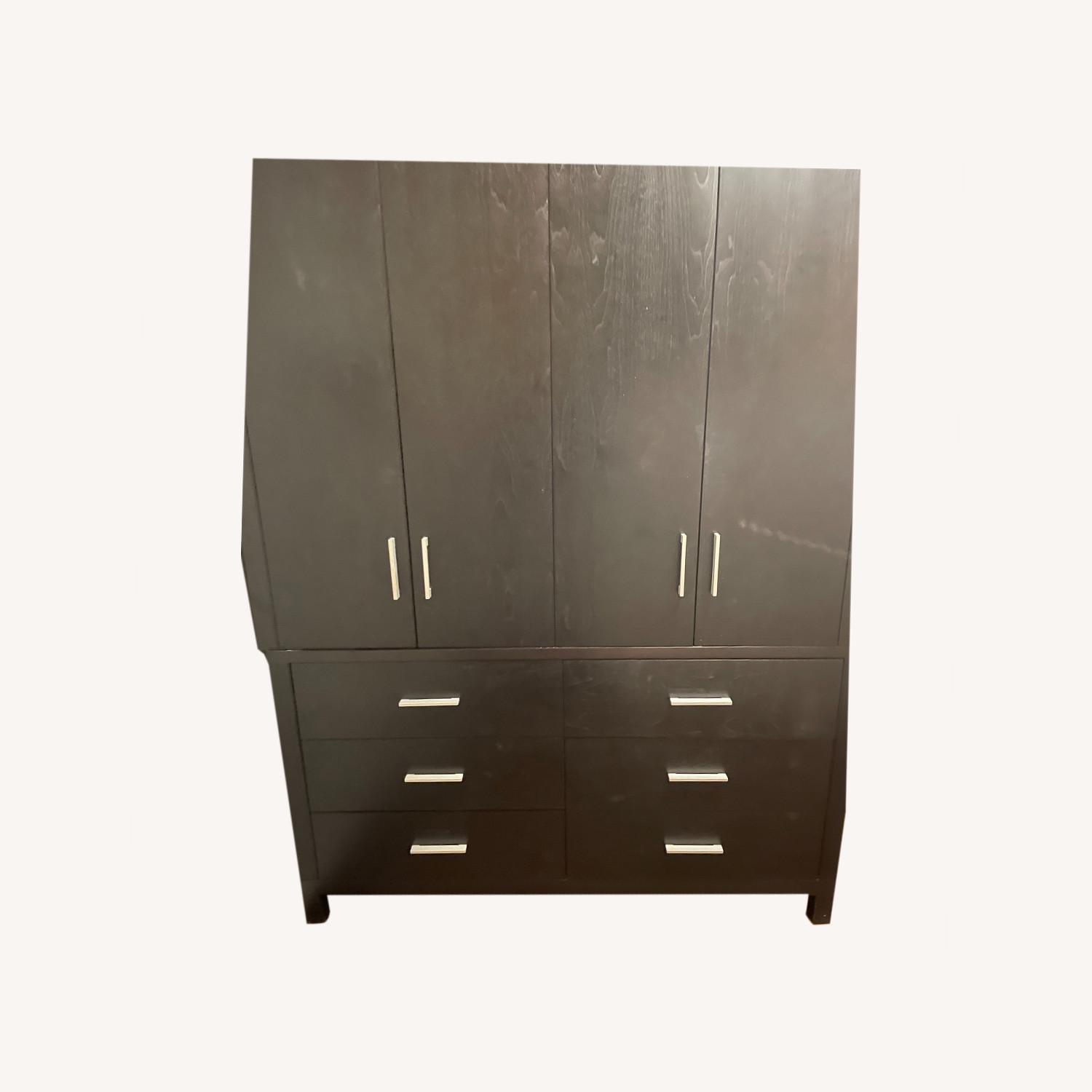 Seller's Notes:Beautiful and functional hand crafted custom armoire. Black walnut exterior with finished maple interior. We custom designed this piece for our small bedroom in order to be beautiful and fit everything we need. 6 drawers with soft touch closing and plenty of shelf space above. We paid $5500. It is in great condition, only a few scratches. It is moved in two pieces. AD21