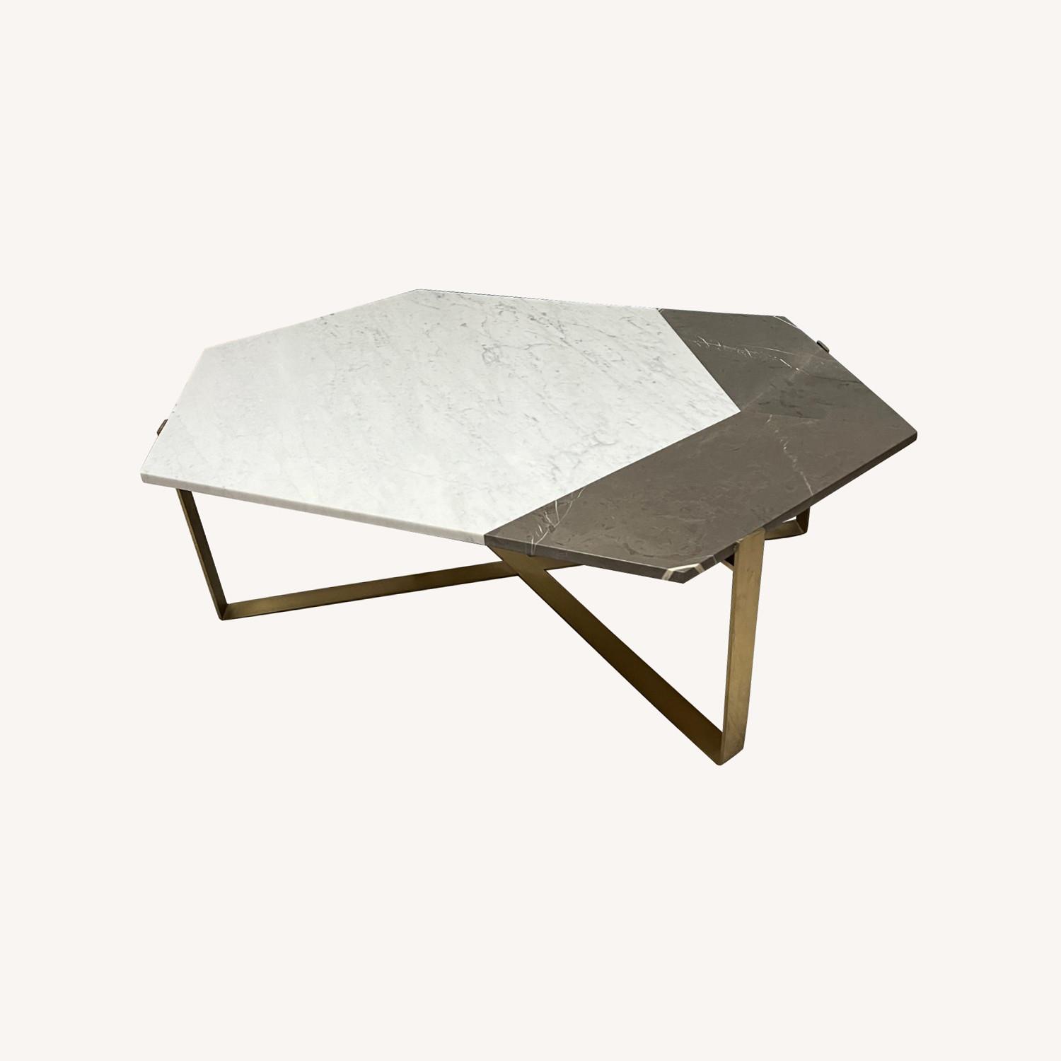 Seller's Notes:This is a beautiful custom marble coffee table with a brass base, featured in Rue Magazine. The marble top is made of Carrara Marble and Pietra Grey Marble with a unique diamond shape. It goes perfectly with many sized sofas. Very minimal wear, no visible etching or discoloration. One tiny chip on the side from when it got knocked during a move, but you have to really inspect it to see it. We are sad to part with this piece, but it doesn't fit in our new home!