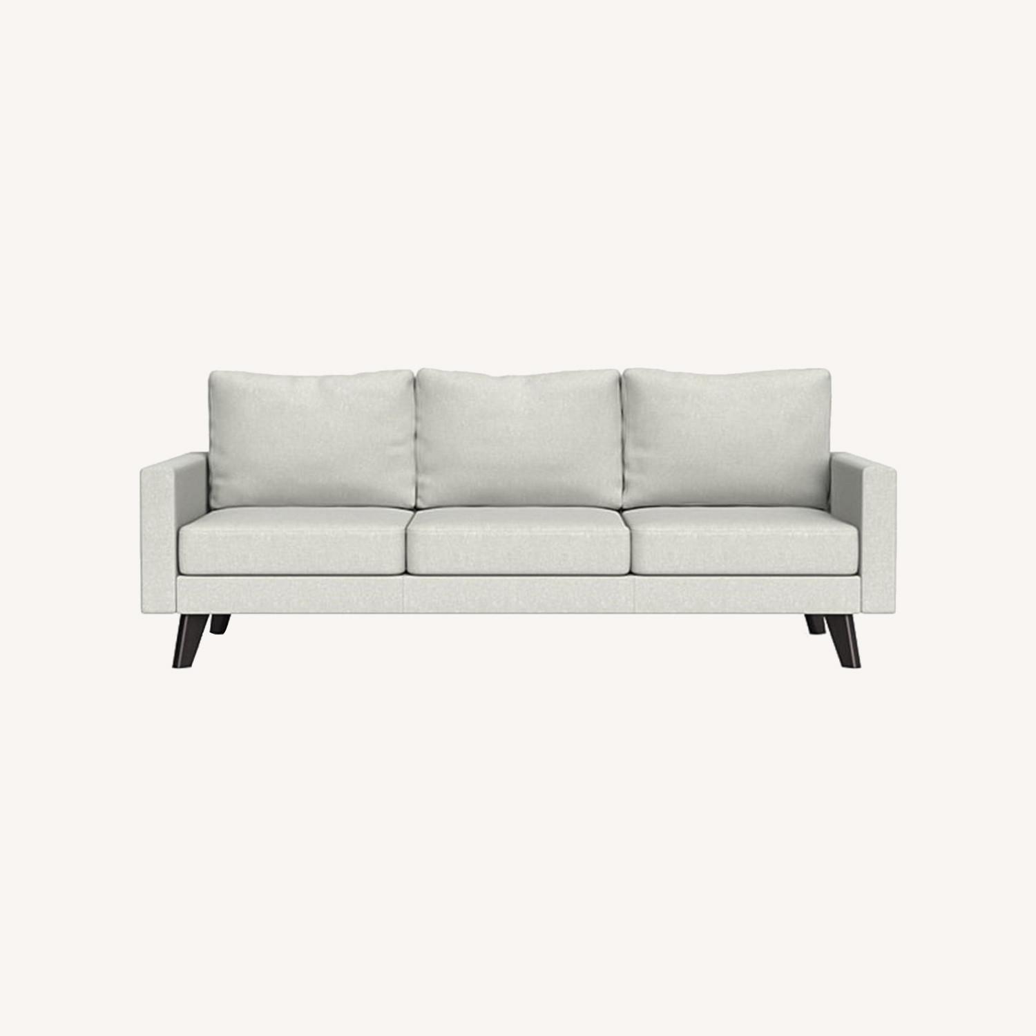 Wear and tear details: This Custom Milo Sofa In Dove Gray is in new condition, some minor chipping in legs and minor dust stains noted which are likely cleanable!