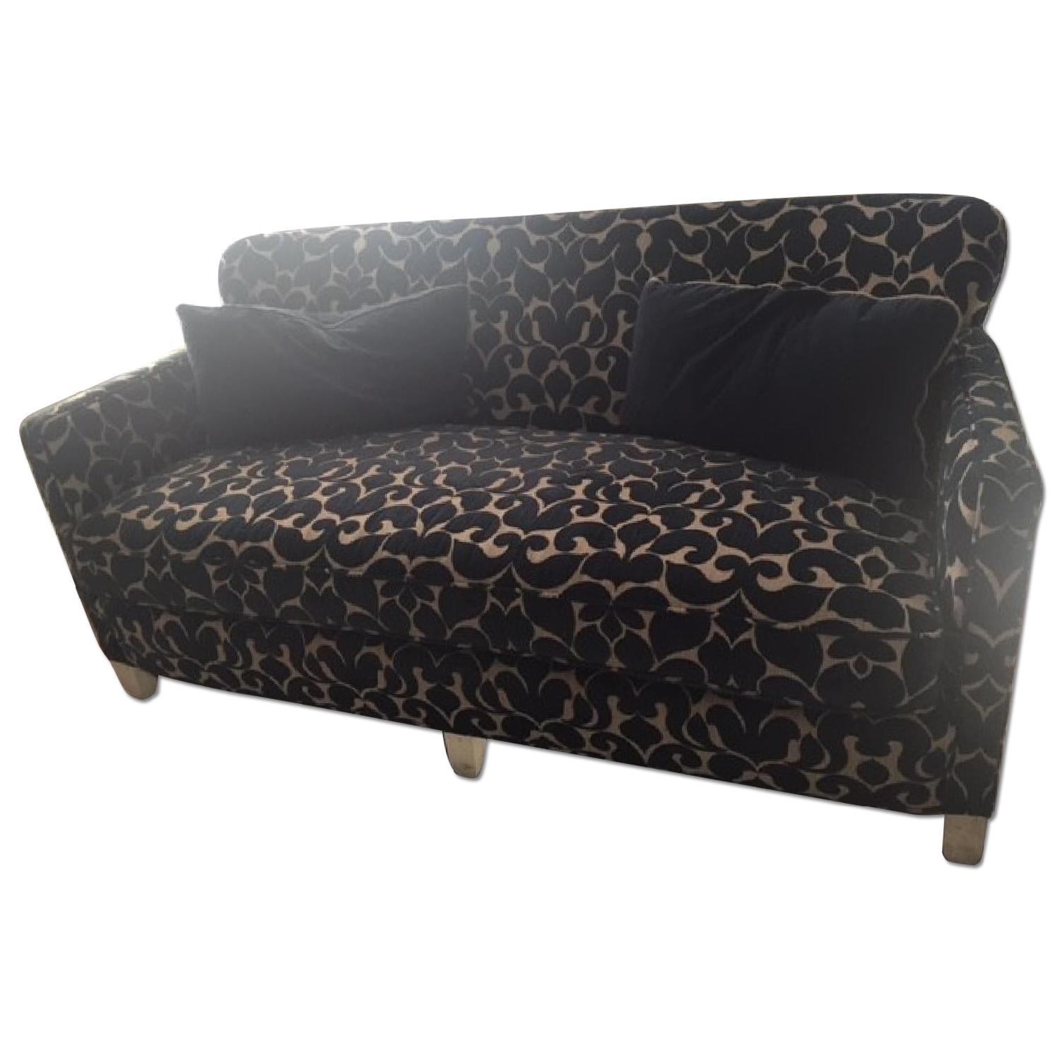 Seller's Notes:Gorgeous custom settee (aka loveseat, sofa) - Navy velvet damask with golden beige contrast and distressed off-white wood legs. Like new. Originally $3,200.