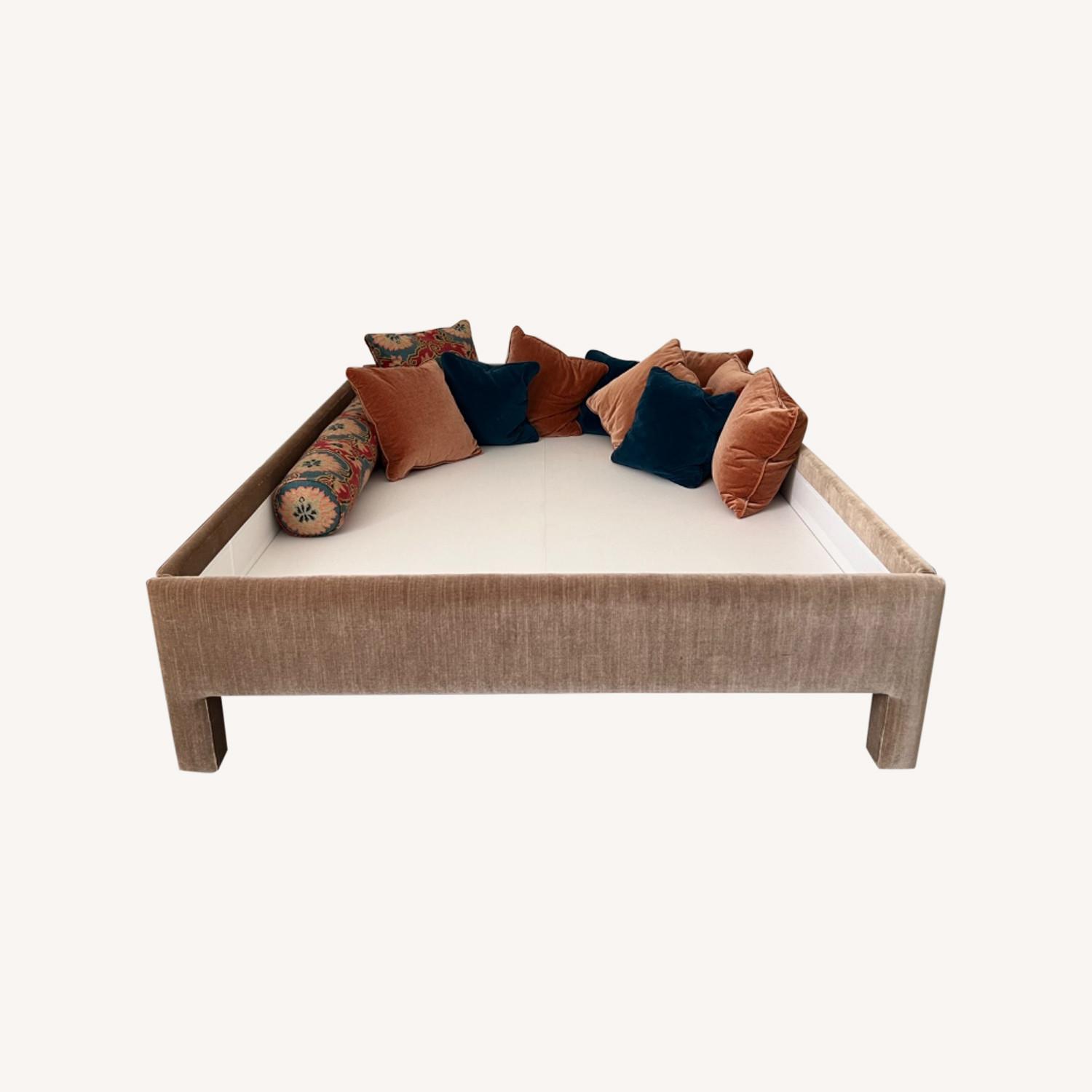 Seller's Notes:Like new custom queen sized bed frame in warm light brown velvet with throw pillows. beautiful piece, we are only selling bc we need to put 2 beds in this room.