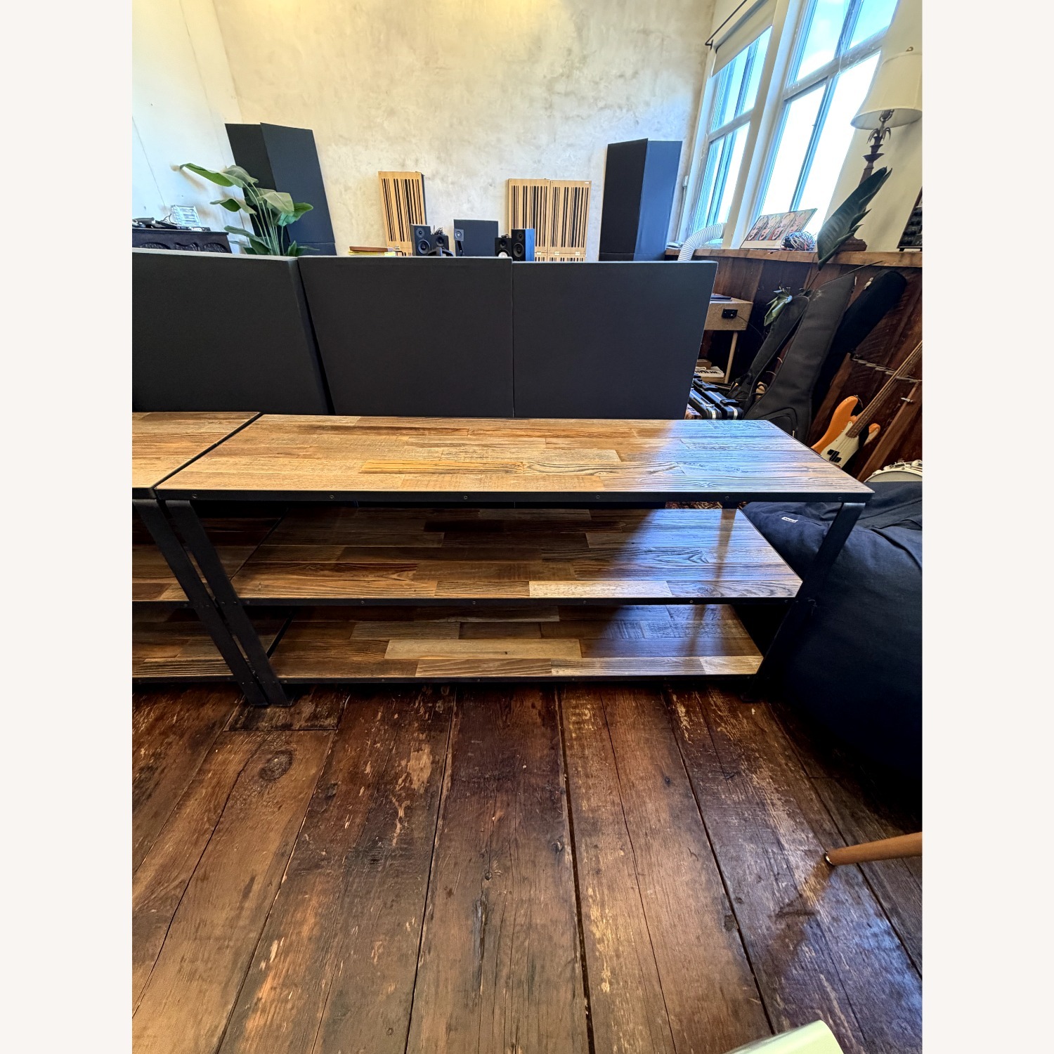 Seller's Notes:This listing is for a reclaimed wood console table with 2 shelves + industrial metal legs. This was a custom order from a woodworking shop on Etsy, purchased a couple years ago. I have two identical ones, with dimensions 60" X 18" X 30". The pictures show both shelves, but priced individually. These are super high quality/heavy duty shelves. Please see photo for original receipt/retail price.