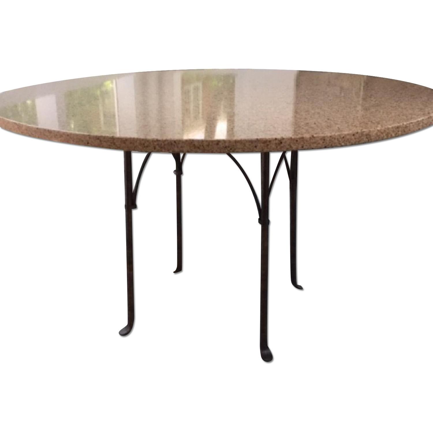 Seller's Notes:This is a custom table, designed with a hand made wrought iron base paired with a silestone top. The versatile style goes with any decor and it seats 5 or 6 chairs depending on the width of the chair. It couldn't be easier to maintain - the materials are indestructible and spills can be wiped up with any product. It can even be used outdoors! We purchased it for an eat in kitchen, but ended moving into a house where it did not fit the new space.