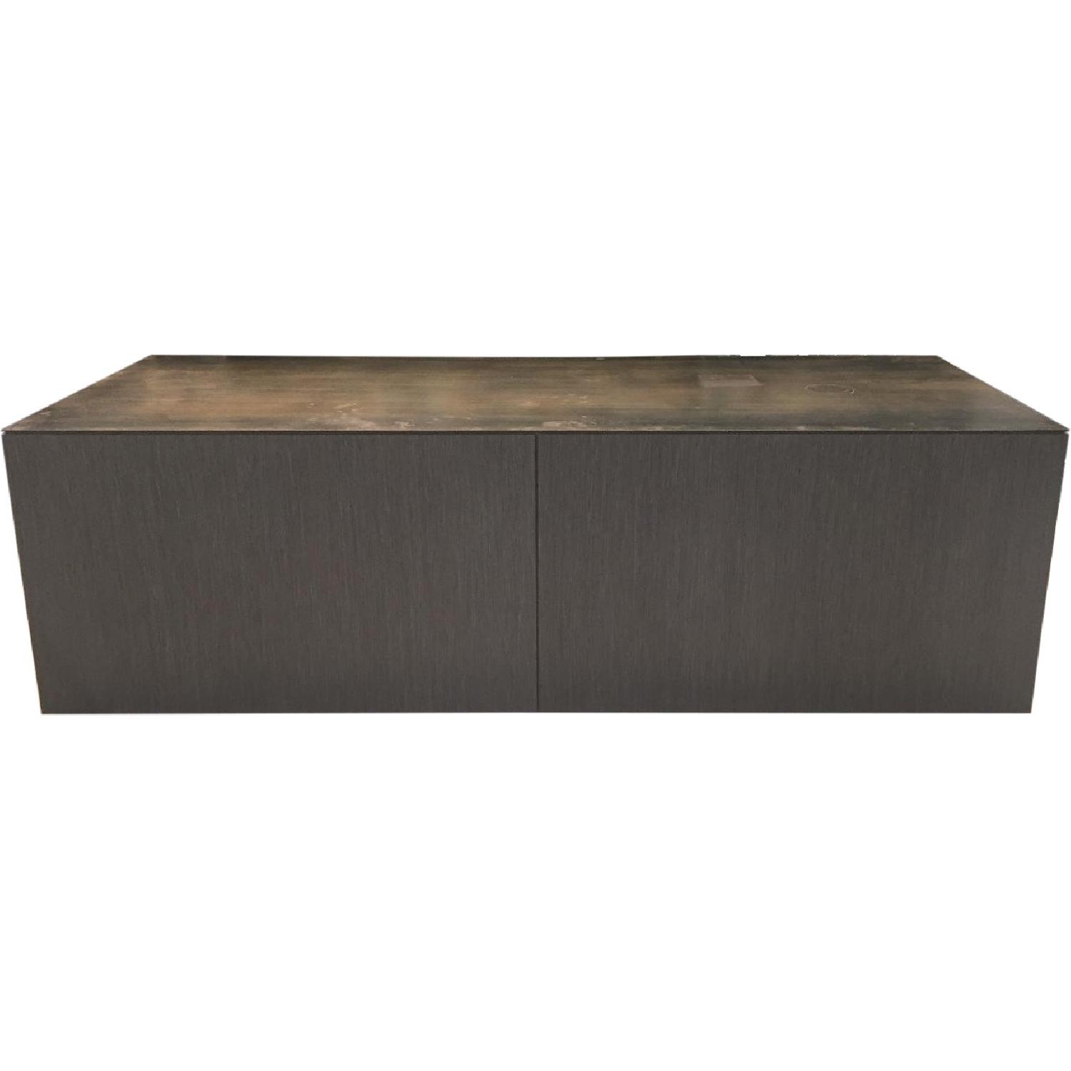 Seller's Notes:Custom made, cold rolled steel top, wood veneer siding, reception style desk. Cut out on top for electrical cords for computer, light, etc. Could also be used as a large credenza in an entrance way. Completely unique.
