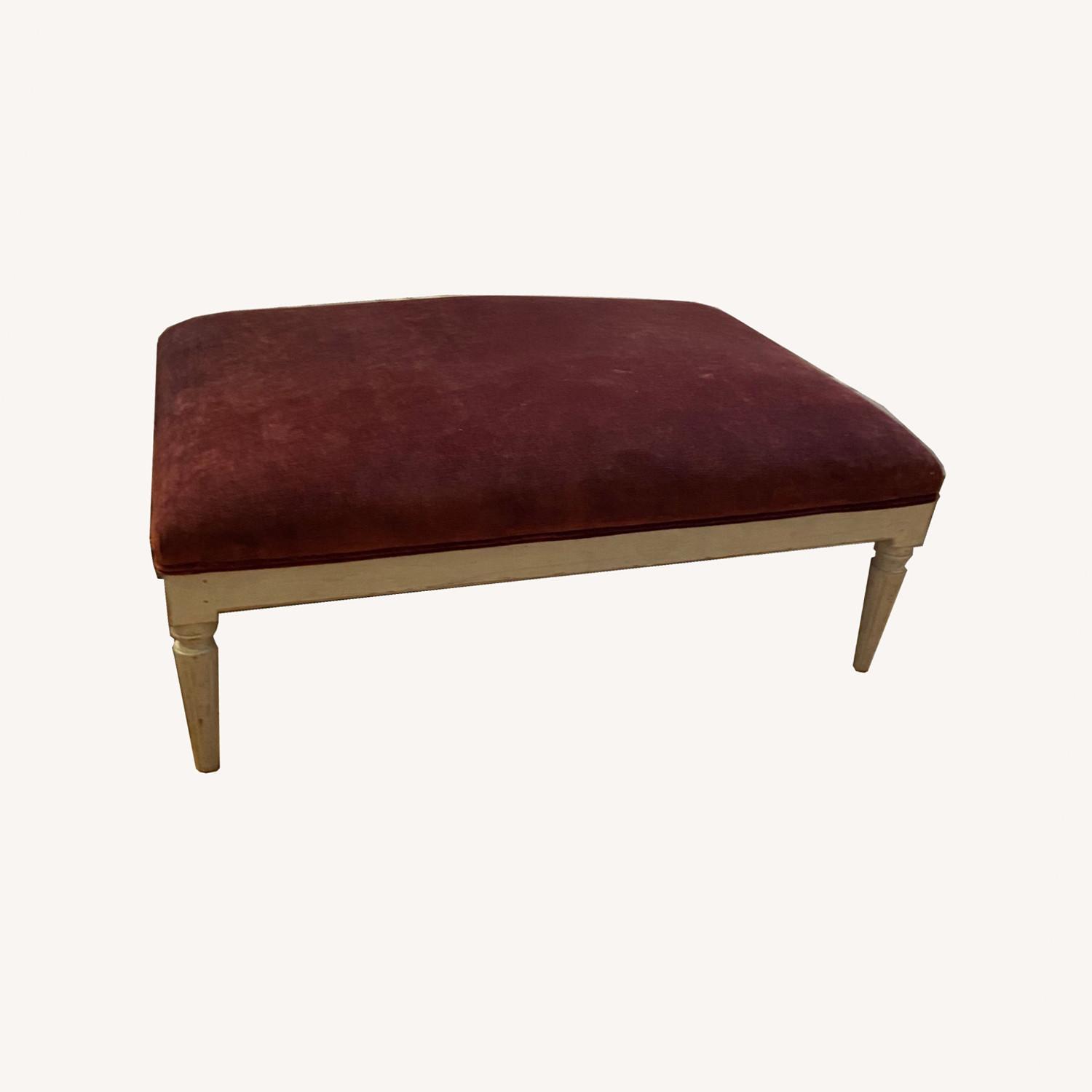 Seller's Notes:Custom upholstered ottoman or footstool. Off-white stained wood base, burgundy velvet top.