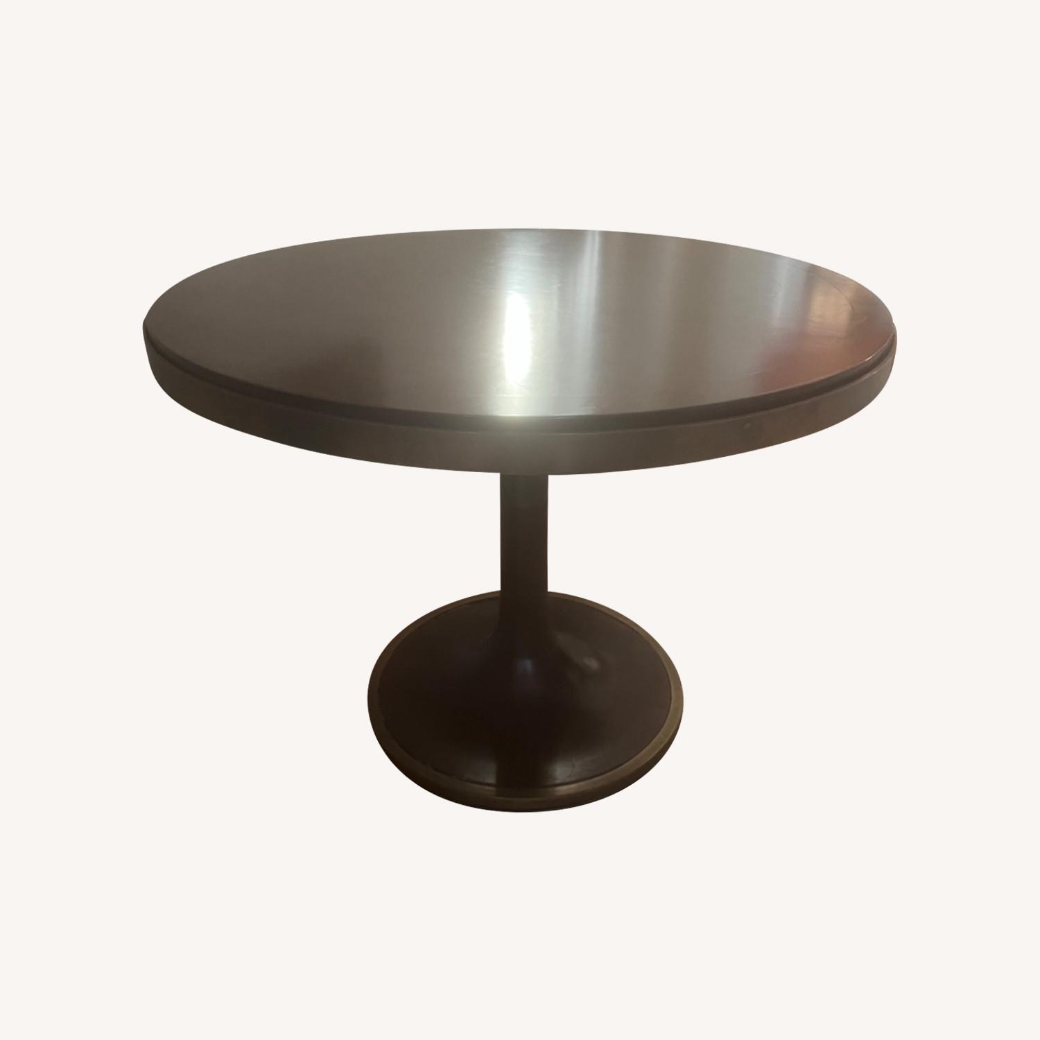Seller's Notes:Custom wood and brass tulip table. Slight wear on the brass trim. Top is detachable from base.