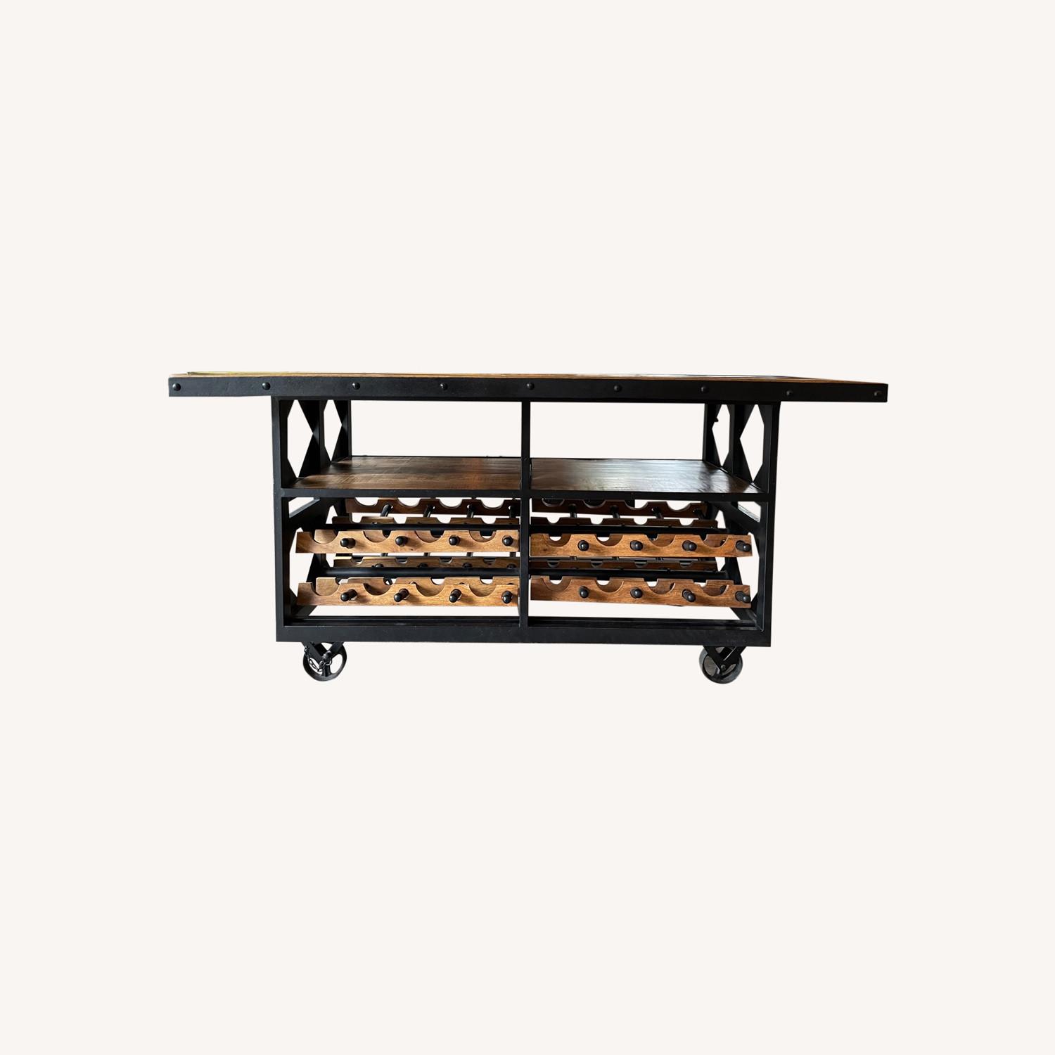 Seller's Notes:We purchased this piece from previous home owner who had it custom built. Black metal with wood top. Has 32 wine bottle capacity.