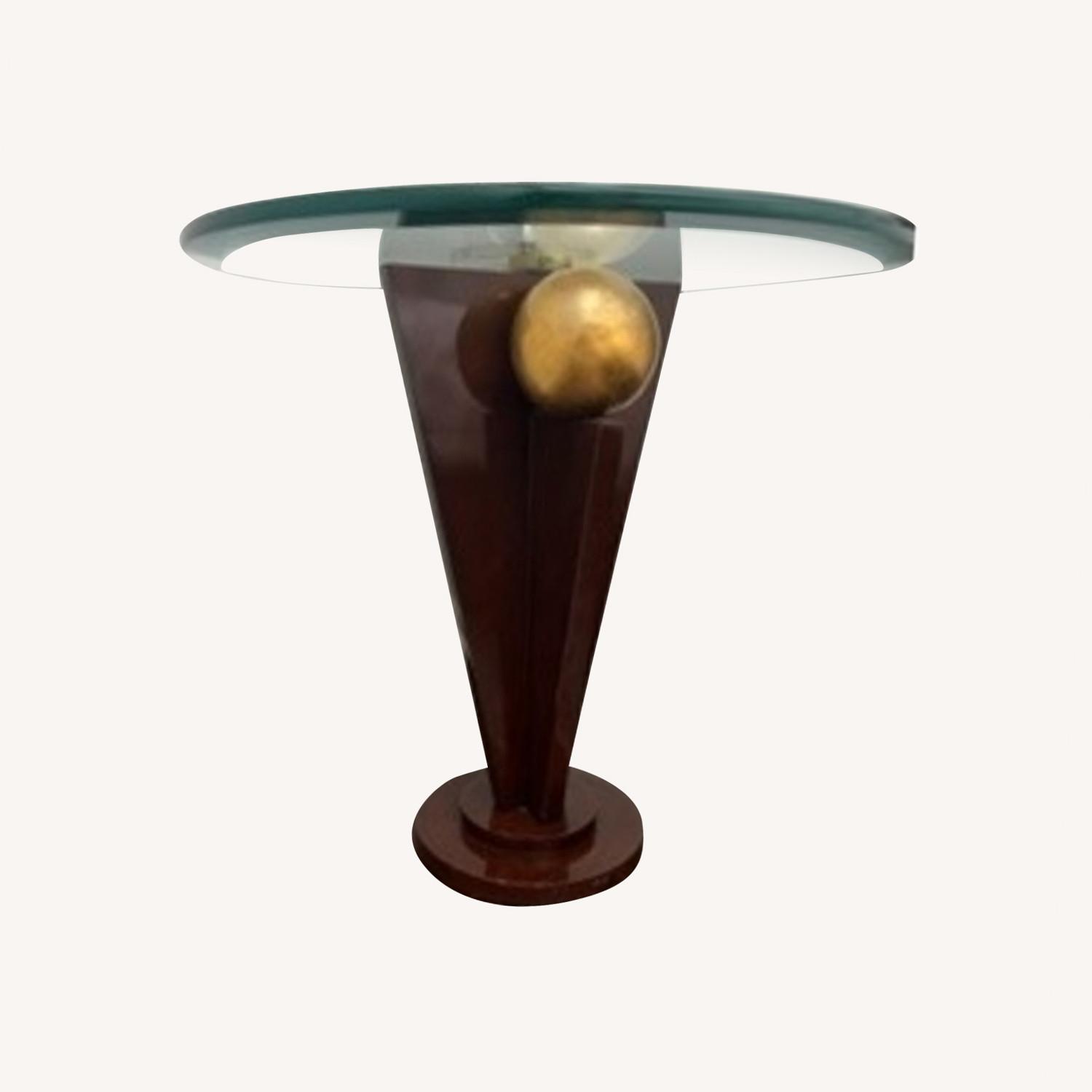 Seller's Notes:A custom made brown lacquered wood side table with glass top and a large gold leaf decorative ball.