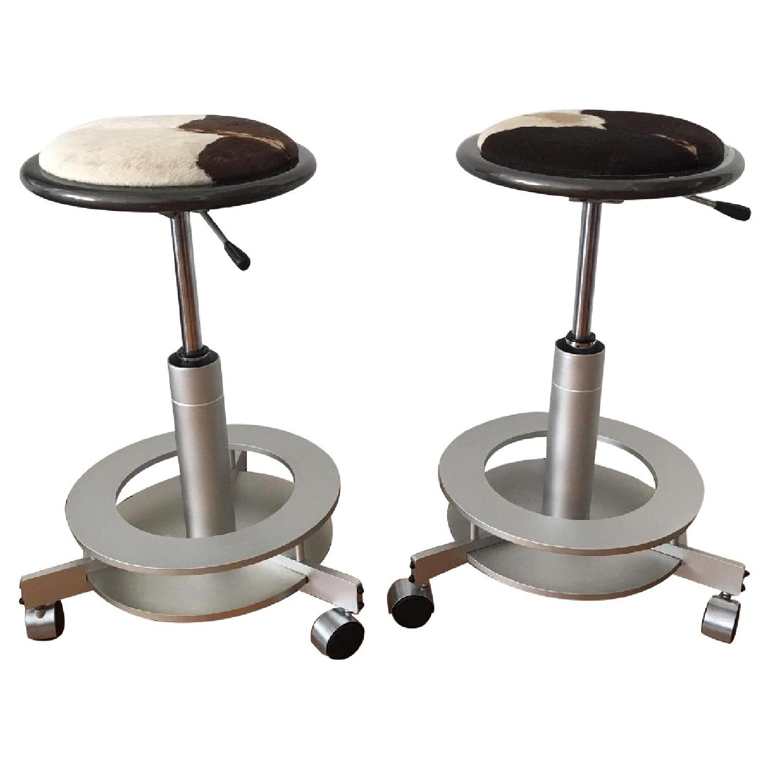 Seller's Notes:Pair of iconic Saturn stools designed in 1976 by Dakota Jackson. Similar stools have been featured in the Brooklyn Museum Decorative Arts Collection. Sandblasted satin aluminum base with a polished polyester lacquered ring with a pony skin inset. Fully upholstered seat pad. 19.5" diameter 21.5 - 29" adjustable seat height 13" upholstery pattern Manufactured 1988. Some chips in lacquered ring on both stools. See photos. Some very small dings in base. Pony skin shows signs of wear consistent with use and age. Still stunning! Sells new for 12K for pair.