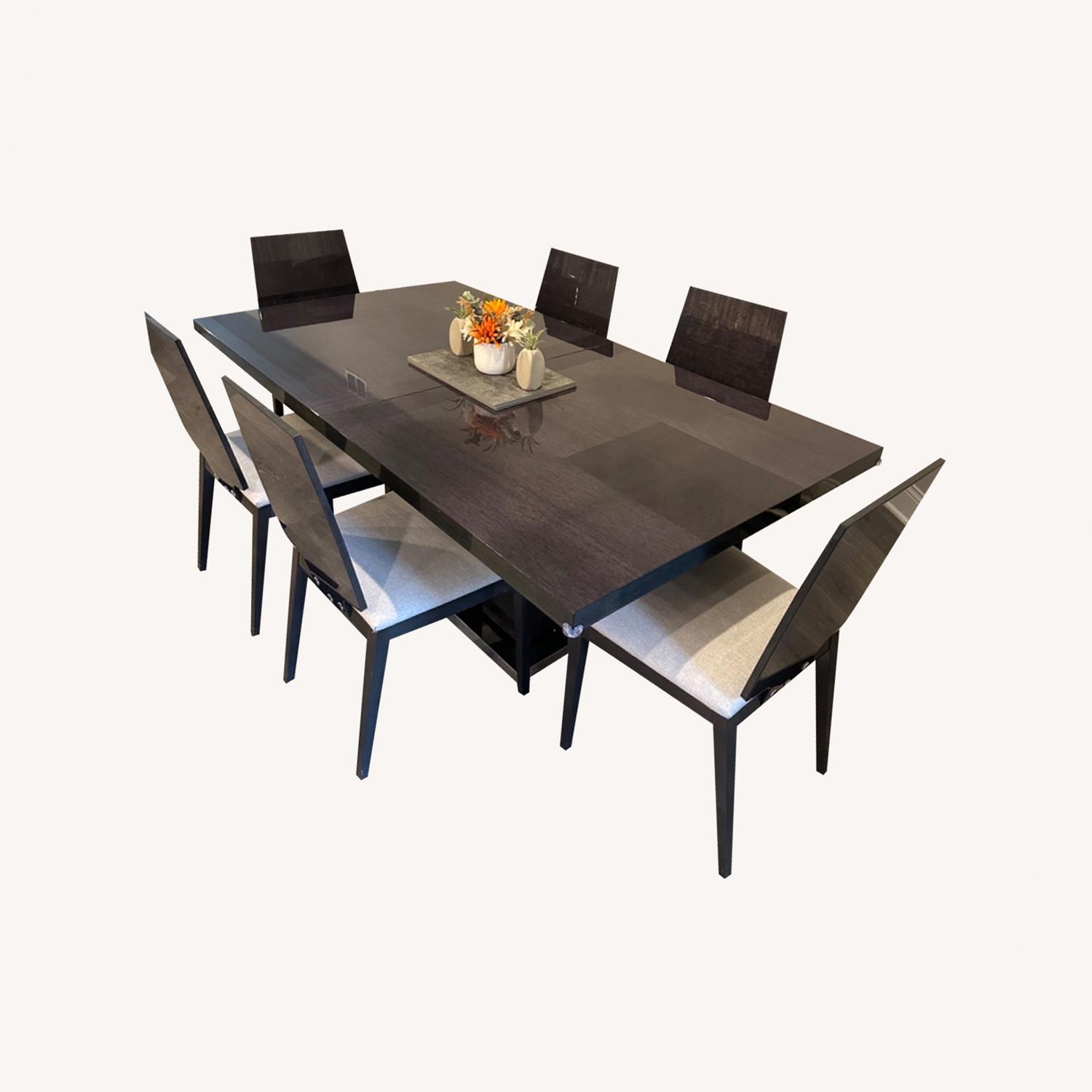 Seller's Notes:Purchased 2 years ago. Great condition. We are moving, so we need to sell it. Made in Italy. Beautiful glossy finish. Table extends to accommodate more chairs. Great deal because chairs are included, but we purchased them separately. Note: Toddler proofed corner protection that is visible in photos will be removed and will not leave any damage to table.