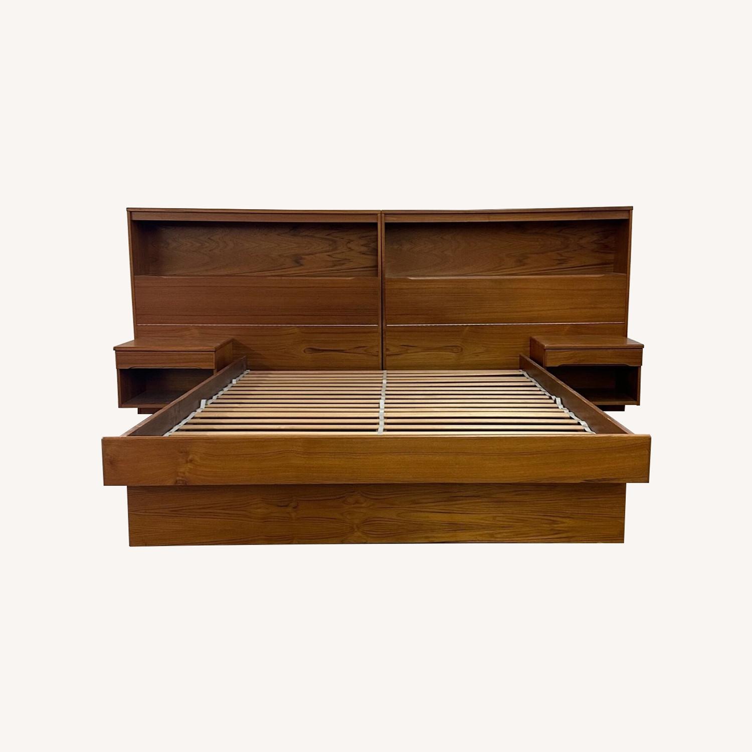 Seller's Notes:W108 D95 H45 Bed D83 W62 H14.59 Inner D81 W60 Mattress clearance 11 Fully reinforced danish bed in teak. In house artisans have added new bottom cleats on the back storage compartments and a new solid wooden liners on the sides and the center supports underneath the slats.Bed storage also has new brass brackets on the drop down doors behind night stands. Bed is in great lightly restored condition with very minor areas of wear but overall shows in aesthetically great condition.