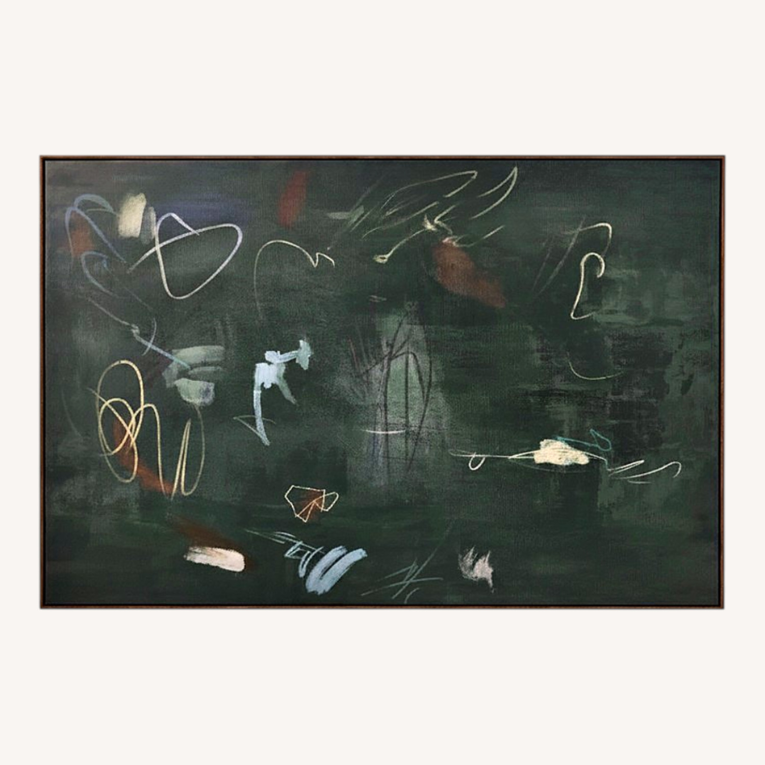 Seller's Notes:Gently used. Excellent condition. • 60"x40 framed abstract wall art in dark, neutral tones • Brown wooden frame • Ideal for vertical or horizontal display with a D-ring mount • Dimensions: 40 inches (H) x 60 inches (W)x 2.05 inches (D)