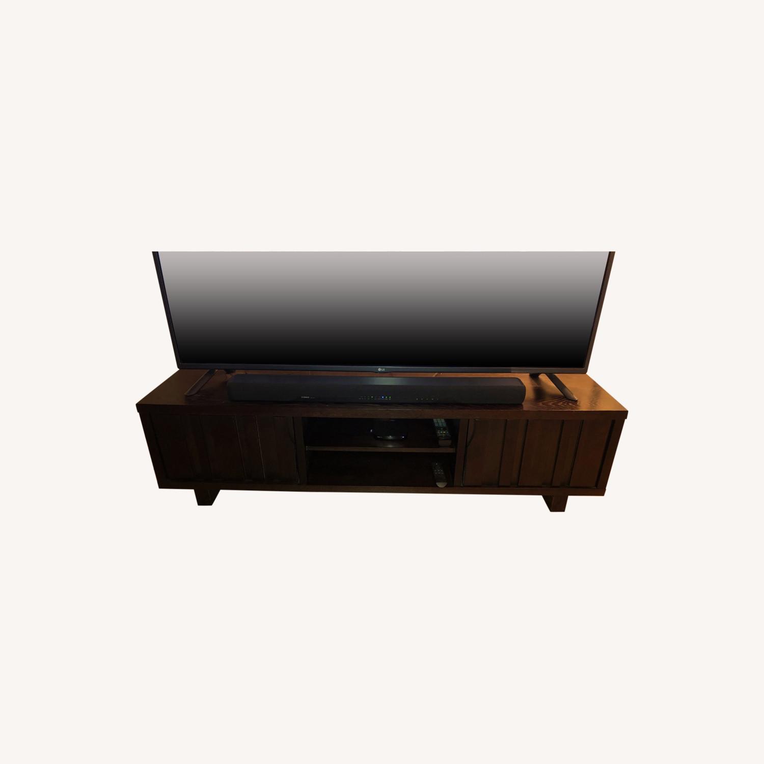 Seller's Notes:Sturdy, dark birch TV stand with classic, stylish look and storage space (Two closed-cabinets and two open shelves with one pass-through hole for cables on top). Blemishes: slight wear/scratch on one of the corners & 2-3 very minor scratches (only visible if look very closely)
